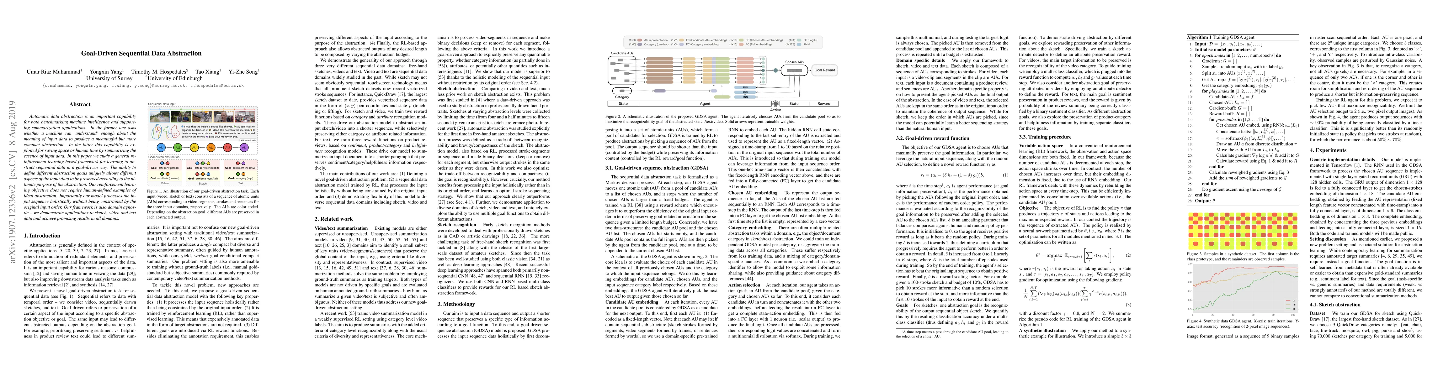 This paper proposes a reinforcement learning framework for goal-driven abstraction of sequential data, enabling applications like summarization without requiring predefined examples. The model processes data holistically and is domain-agnostic, demonstrating effectiveness across sketch, video, and text data.
