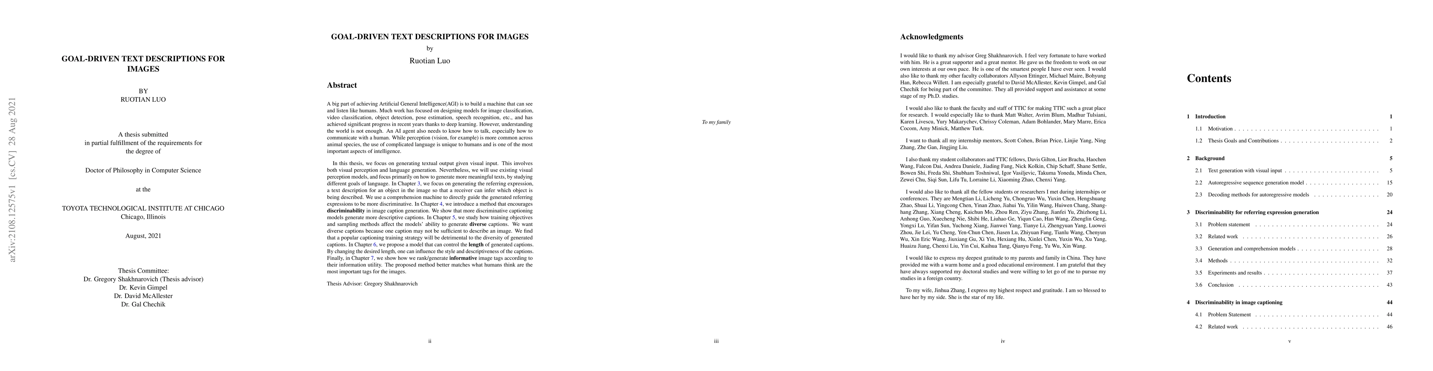 A big part of achieving Artificial General Intelligence(AGI) is to build a machine that can see and listen like humans. Much work has focused on designing models for image classification, video classification, object detection, pose estimation, speech recognition, etc., and has achieved significant progress in recent years thanks to deep learning. However, understanding the world is not enough. An AI agent also needs to know how to talk, especially how to communicate with a human. While perception (vision, for example) is more common across animal species, the use of complicated language is unique to humans and is one of the most important aspects of intelligence. In this thesis, we focus on generating textual output given visual input. In Chapter 3, we focus on generating the referring expression, a text description for an object in the image so that a receiver can infer which object is being described. We use a comprehension machine to directly guide the generated referring expressions to be more discriminative. In Chapter 4, we introduce a method that encourages discriminability in image caption generation. We show that more discriminative captioning models generate more descriptive captions. In Chapter 5, we study how training objectives and sampling methods affect the models' ability to generate diverse captions. We find that a popular captioning training strategy will be detrimental to the diversity of generated captions. In Chapter 6, we propose a model that can control the length of generated captions. By changing the desired length, one can influence the style and descriptiveness of the captions. Finally, in Chapter 7, we rank/generate informative image tags according to their information utility. The proposed method better matches what humans think are the most important tags for the images.