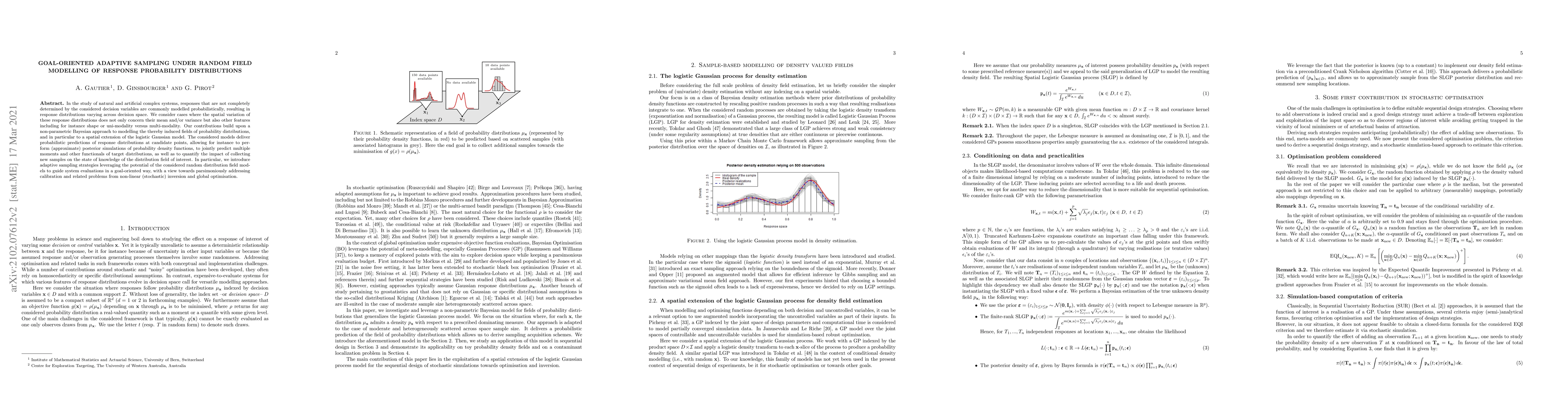 In the study of natural and artificial complex systems, responses that are not completely determined by the considered decision variables are commonly modelled probabilistically, resulting in response distributions varying across decision space. We consider cases where the spatial variation of these response distributions does not only concern their mean and/or variance but also other features including for instance shape or uni-modality versus multi-modality. Our contributions build upon a non-parametric Bayesian approach to modelling the thereby induced fields of probability distributions, and in particular to a spatial extension of the logistic Gaussian model. The considered models deliver probabilistic predictions of response distributions at candidate points, allowing for instance to perform (approximate) posterior simulations of probability density functions, to jointly predict multiple moments and other functionals of target distributions, as well as to quantify the impact of collecting new samples on the state of knowledge of the distribution field of interest. In particular, we introduce adaptive sampling strategies leveraging the potential of the considered random distribution field models to guide system evaluations in a goal-oriented way, with a view towards parsimoniously addressing calibration and related problems from non-linear (stochastic) inversion and global optimisation.