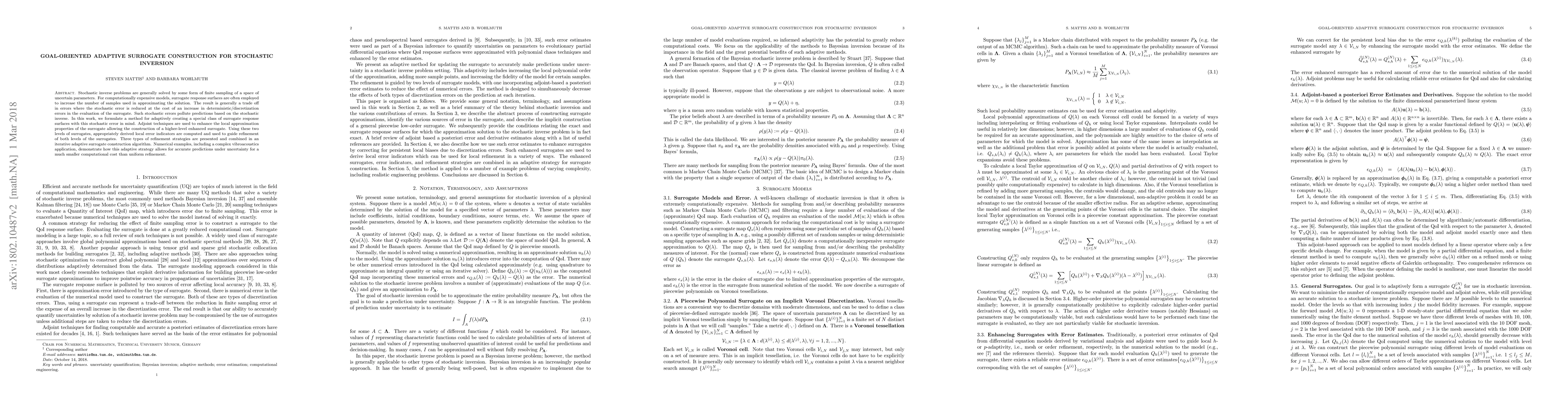 Stochastic inverse problems are generally solved by some form of finite sampling of a space of uncertain parameters. For computationally expensive models, surrogate response surfaces are often employed to increase the number of samples used in approximating the solution. The result is generally a trade off in errors where the stochastic error is reduced at the cost of an increase in deterministic/discretization errors in the evaluation of the surrogate. Such stochastic errors pollute predictions based on the stochastic inverse. In this work, we formulate a method for adaptively creating a special class of surrogate response surfaces with this stochastic error in mind. Adjoint techniques are used to enhance the local approximation properties of the surrogate allowing the construction of a higher-level enhanced surrogate. Using these two levels of surrogates, appropriately derived local error indicators are computed and used to guide refinement of both levels of the surrogates. Three types of refinement strategies are presented and combined in an iterative adaptive surrogate construction algorithm. Numerical examples, including a complex vibroacoustics application, demonstrate how this adaptive strategy allows for accurate predictions under uncertainty for a much smaller computational cost than uniform refinement.