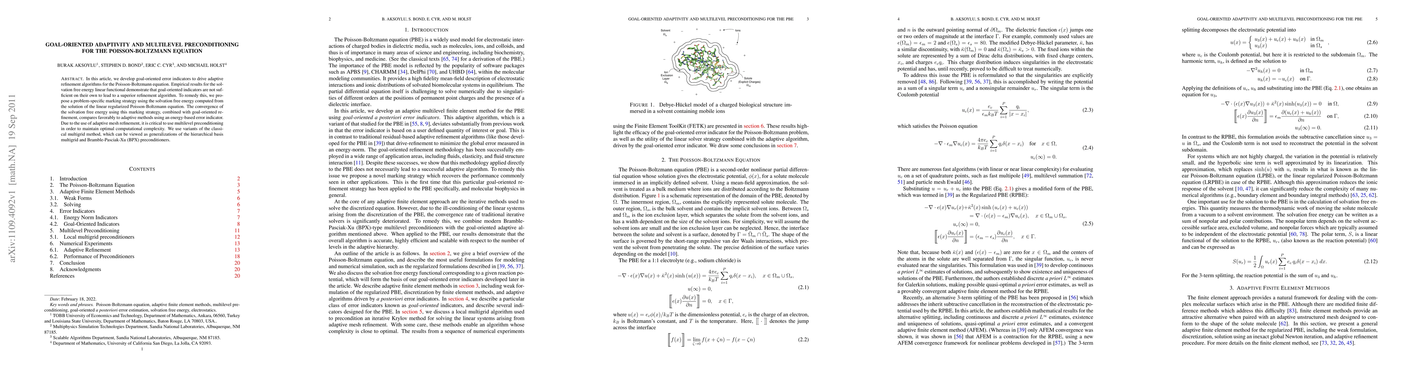 This paper develops goal-oriented adaptive refinement algorithms for the Poisson-Boltzmann equation, showing that a problem-specific marking strategy enhances refinement efficiency. It also employs multilevel preconditioning to maintain computational efficiency, achieving better convergence for solvation free energy calculations.