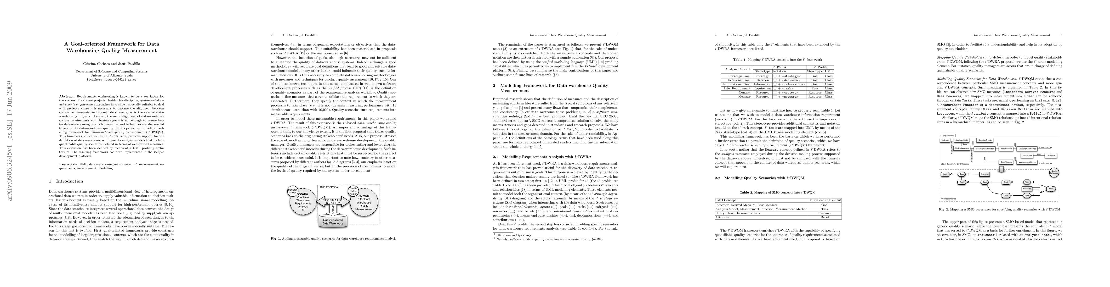 The research presents a modelling framework, i*DWQM, for data-warehouse quality measurement, extending i*DWRA with a UML profiling architecture implemented in the Eclipse development platform.