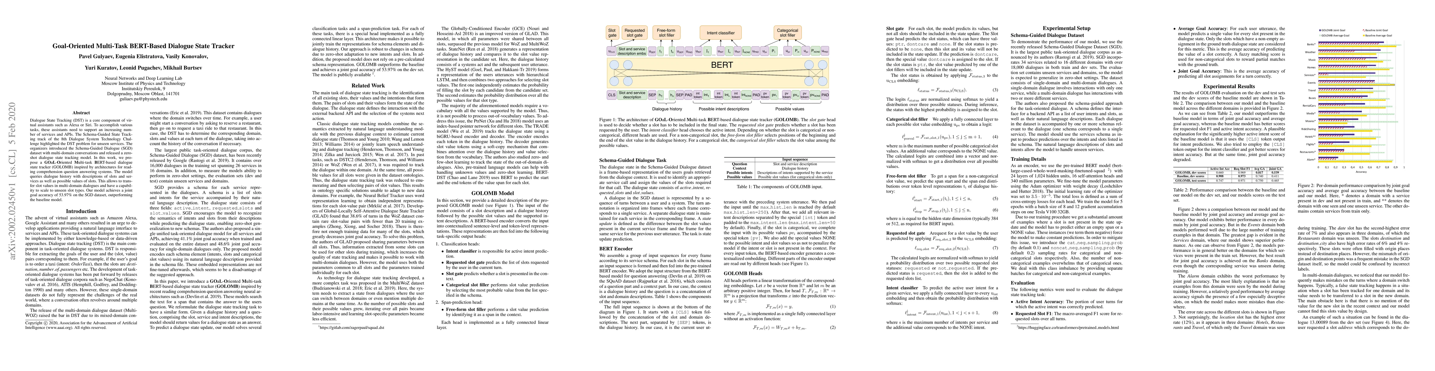 This paper proposes a GOaL-Oriented Multi-task BERT-based Dialogue State Tracker (GOLOMB) to improve dialogue state tracking in virtual assistants. The model queries dialogue history with slot descriptions and values, enabling it to scale to unseen slot types and achieve a joint goal accuracy of 53.97% on the Schema-Guided Dialogue dataset, outperforming baseline models.