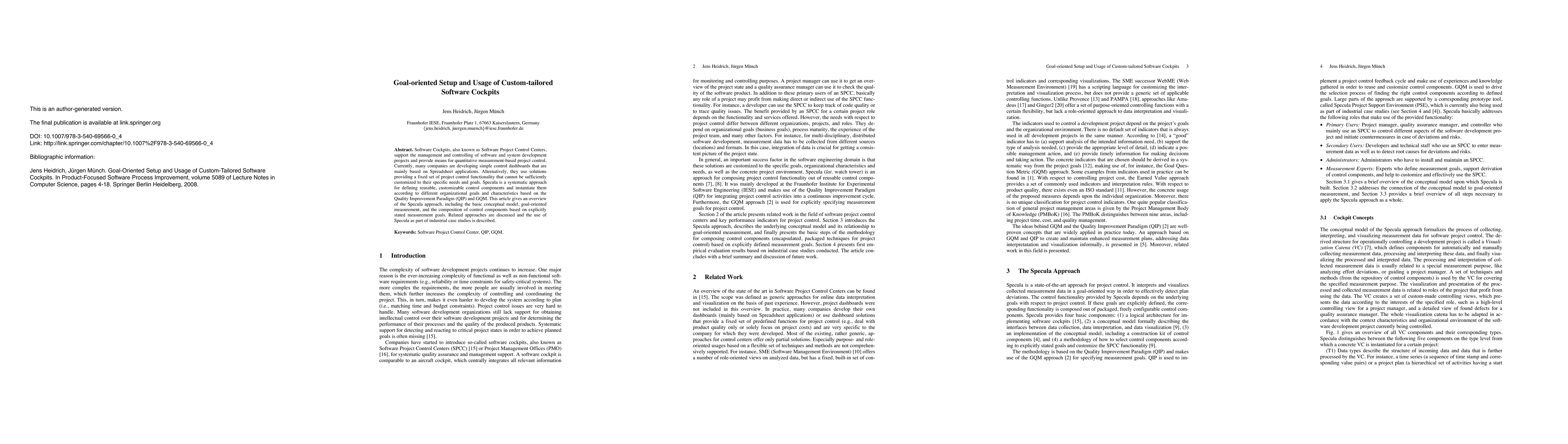 This paper introduces the Specula approach for creating customizable software cockpits tailored to specific organizational goals, based on the Quality Improvement Paradigm (QIP) and GQM. It discusses the conceptual model, goal-oriented measurement, and industrial case studies demonstrating its application.