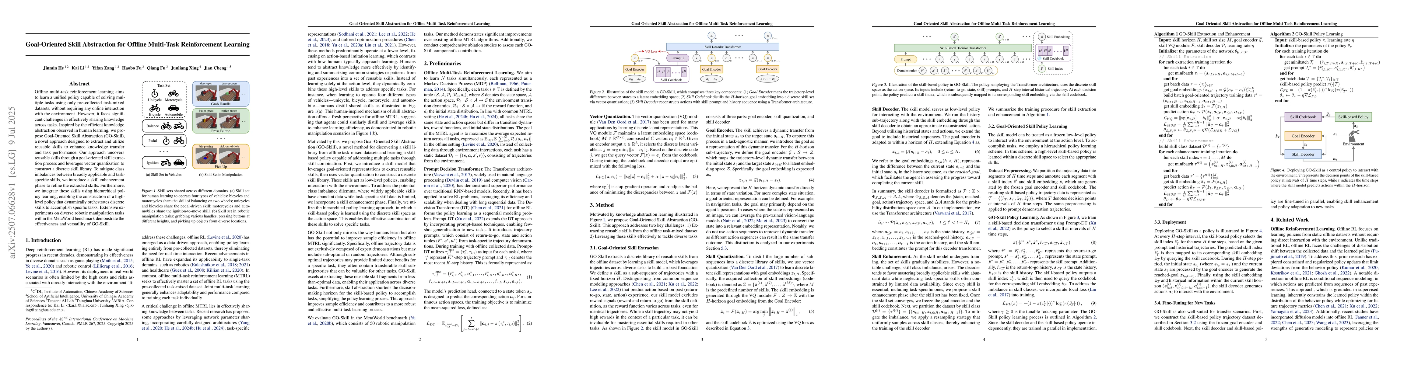 The research introduces Goal-Oriented Skill Abstraction (GO-Skill) for offline multi-task reinforcement learning, enabling efficient knowledge transfer across tasks using a discrete skill library. Experiments on robotic manipulation tasks show GO-Skill's effectiveness in dynamically orchestrating skills to accomplish diverse tasks.