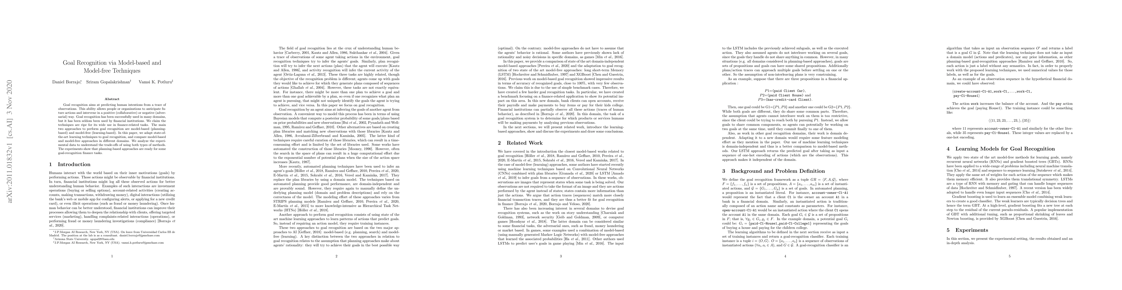 This paper explores goal recognition techniques, comparing model-based planning and model-free learning methods to predict human intentions from observations. The study finds that planning-based approaches are promising for certain finance-related goal-recognition tasks.