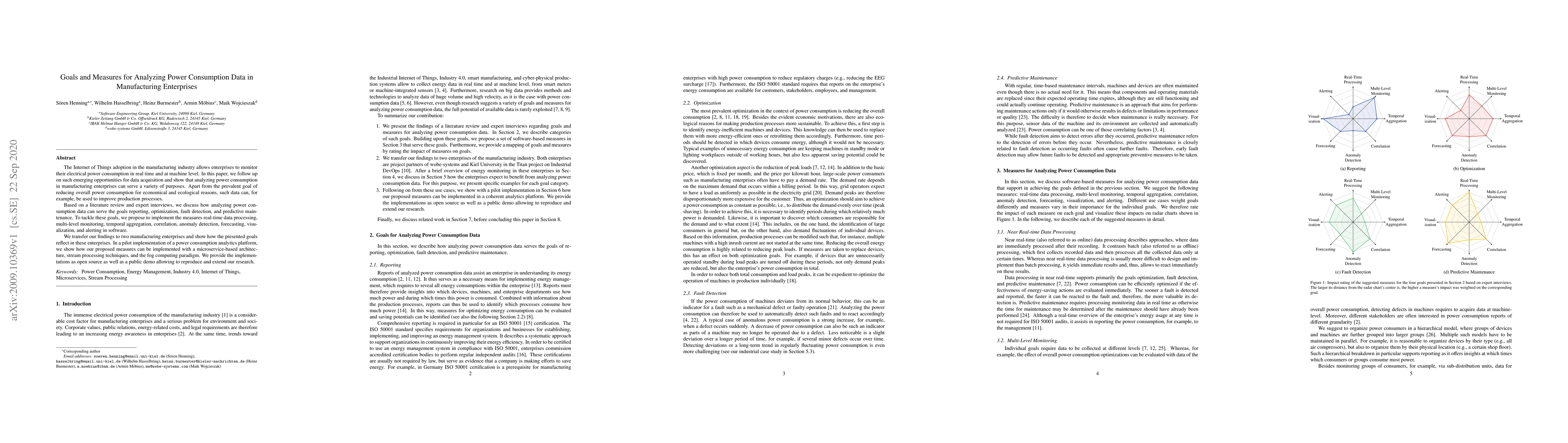 This paper explores the use of IoT-enabled real-time power consumption data in manufacturing to achieve various goals such as reporting, optimization, fault detection, and predictive maintenance. It proposes a set of analytical measures and demonstrates their implementation in a pilot project, providing open-source tools for reproducibility.