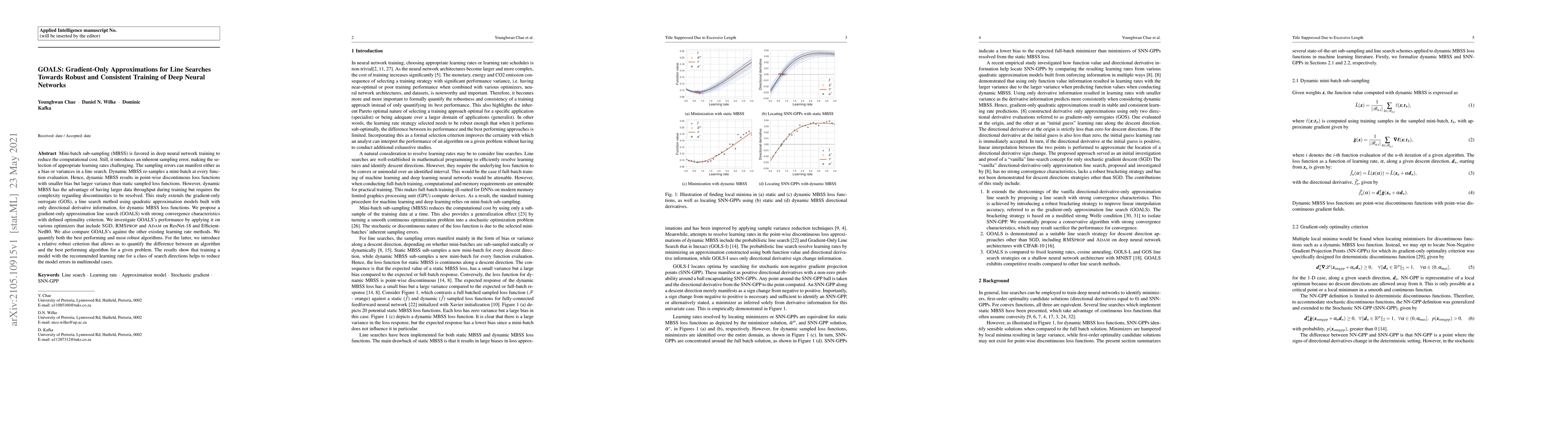 Mini-batch sub-sampling (MBSS) is favored in deep neural network training to reduce the computational cost. Still, it introduces an inherent sampling error, making the selection of appropriate learning rates challenging. The sampling errors can manifest either as a bias or variances in a line search. Dynamic MBSS re-samples a mini-batch at every function evaluation. Hence, dynamic MBSS results in point-wise discontinuous loss functions with smaller bias but larger variance than static sampled loss functions. However, dynamic MBSS has the advantage of having larger data throughput during training but requires the complexity regarding discontinuities to be resolved. This study extends the gradient-only surrogate (GOS), a line search method using quadratic approximation models built with only directional derivative information, for dynamic MBSS loss functions. We propose a gradient-only approximation line search (GOALS) with strong convergence characteristics with defined optimality criterion. We investigate GOALS's performance by applying it on various optimizers that include SGD, RMSprop and Adam on ResNet-18 and EfficientNetB0. We also compare GOALS's against the other existing learning rate methods. We quantify both the best performing and most robust algorithms. For the latter, we introduce a relative robust criterion that allows us to quantify the difference between an algorithm and the best performing algorithm for a given problem. The results show that training a model with the recommended learning rate for a class of search directions helps to reduce the model errors in multimodal cases.