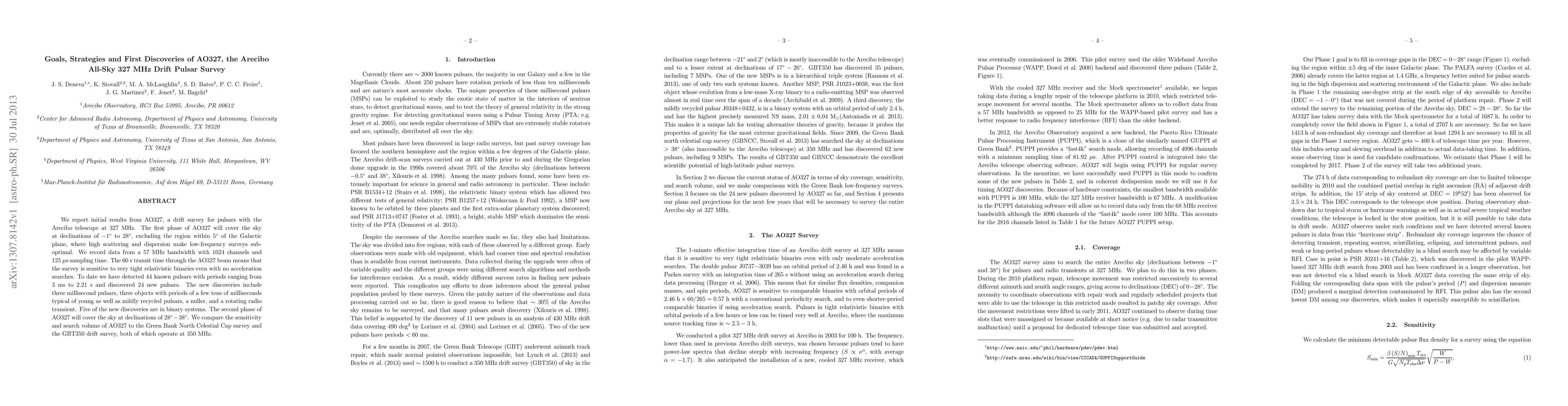 The AO327 survey at Arecibo using 327 MHz has detected 44 known pulsars and discovered 24 new pulsars, including millisecond pulsars and a rotating radio transient. The survey's sensitivity allows it to identify tight relativistic binaries, and the second phase will extend its declination coverage.