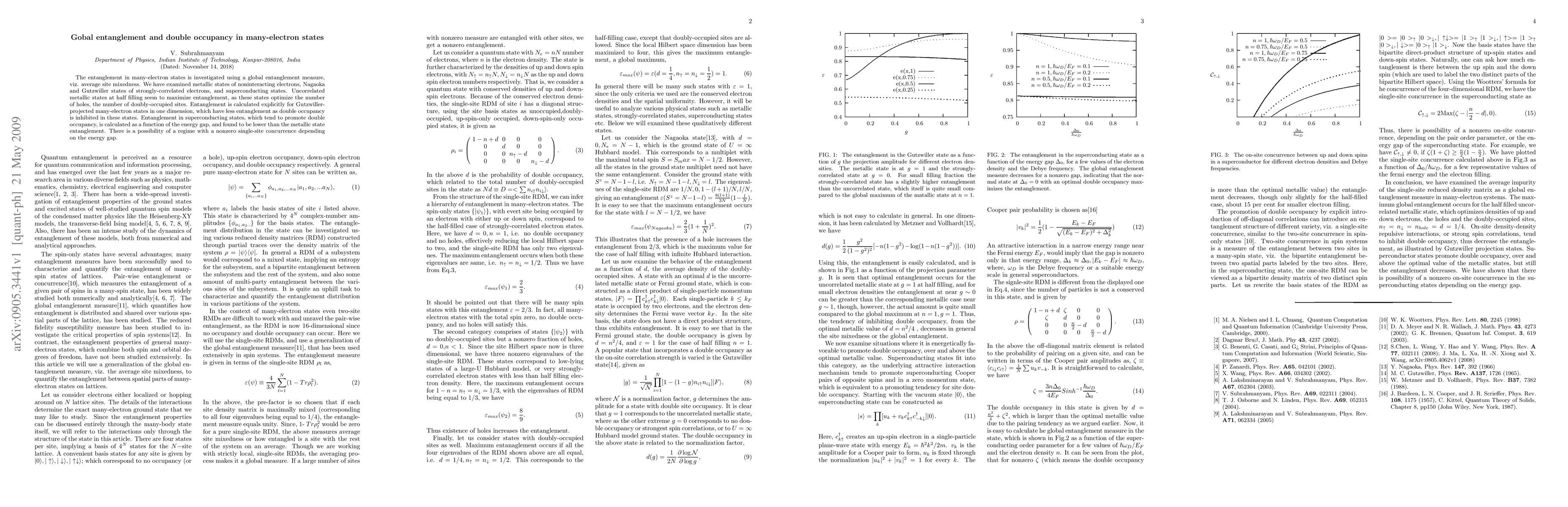 This paper investigates entanglement in many-electron states using average site mixedness, finding that uncorrelated metallic states at half filling maximize entanglement due to optimal double occupancy. Superconducting states, which also promote double occupancy, show lower entanglement compared to metallic states, with potential nonzero single-site concurrence depending on the energy gap.