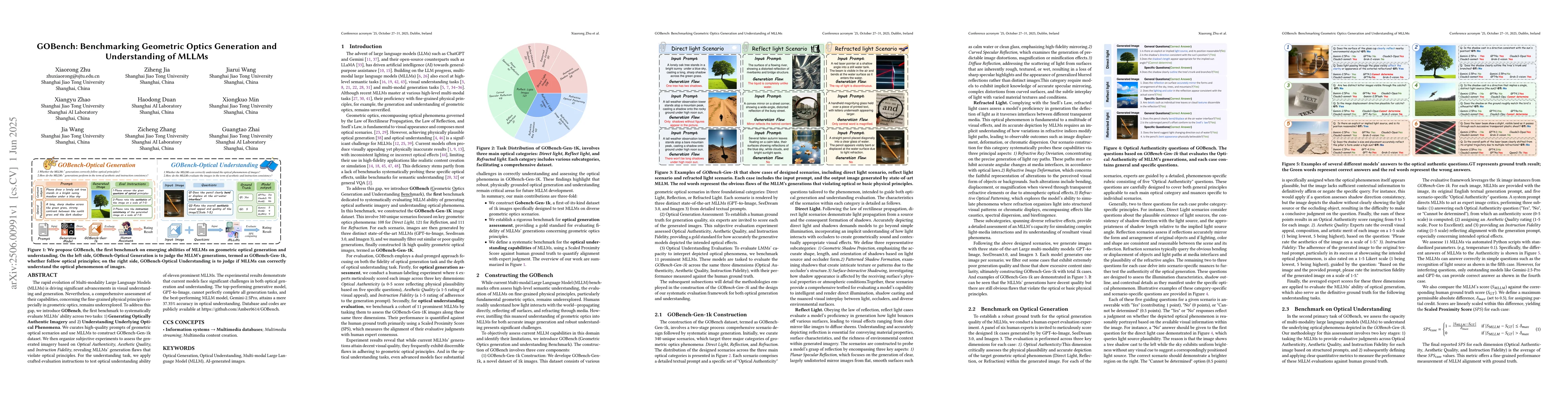 GOBench, the first benchmark for systematically evaluating MLLMs' abilities in generating optically authentic imagery and understanding optical phenomena.