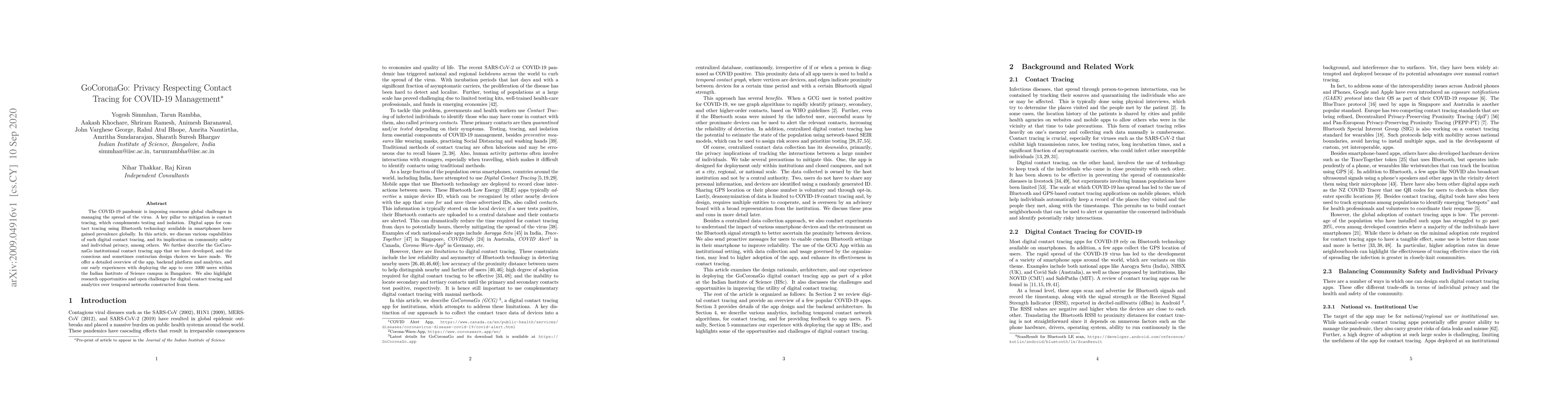 A contact tracing app called GoCoronaGo was developed to balance community safety with individual privacy during COVID-19 management. The app has been deployed to over 1000 users in India and highlights opportunities for research in digital contact tracing and analytics.