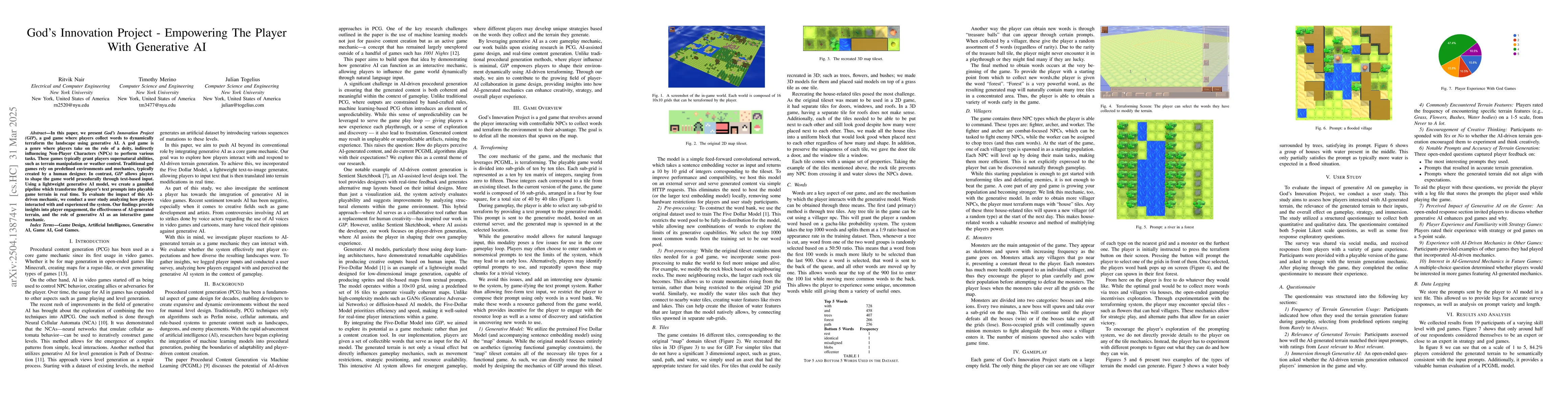 The paper presents God's Innovation Project (GIP), a god game utilizing generative AI to transform player text prompts into real-time, playable game terrain. It employs a lightweight AI model for this purpose.