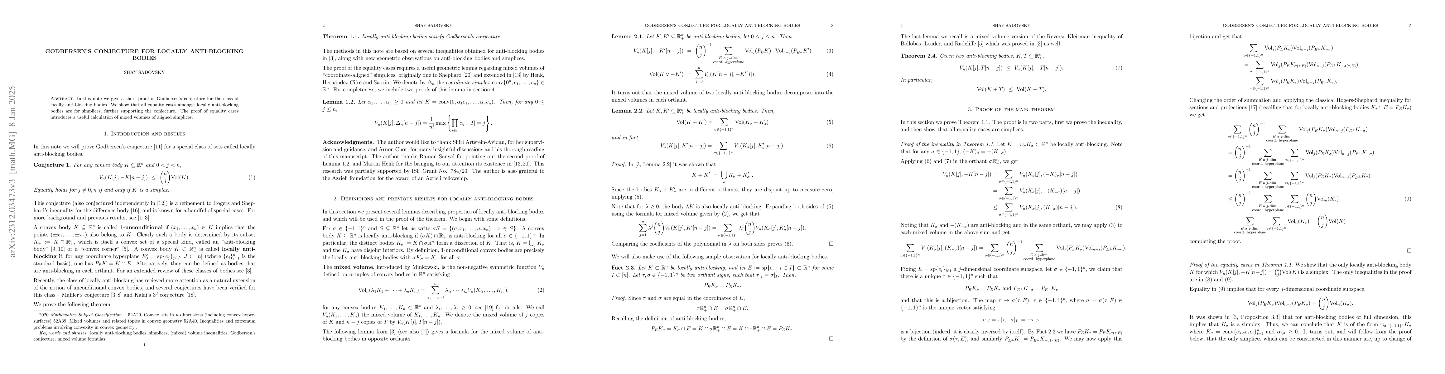 This paper provides a concise proof for Godbersen's conjecture concerning locally anti-blocking bodies, demonstrating that equality cases occur only for simplices and introducing a valuable calculation of mixed volumes of aligned simplices.
