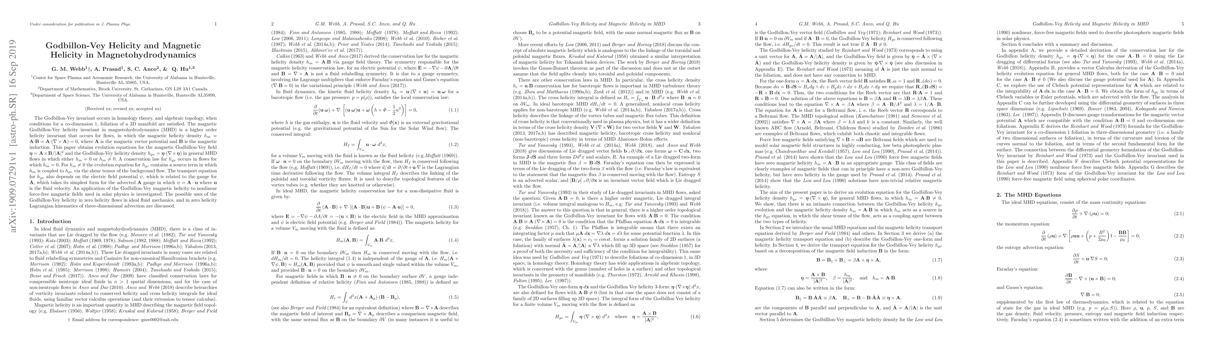 The Godbillon-Vey invariant occurs in homology theory, and algebraic topology, when conditions for a co-dimension 1, foliation of a 3D manifold are satisfied. The magnetic Godbillon-Vey helicity invariant in magnetohydrodynamics (MHD) is a higher order helicity invariant that occurs for flows, in which the magnetic helicity density $h_m={\bf A}{\bf\cdot}{\bf B}={\bf A}{\bf\cdot}(\nabla\times{\bf A})=0$, where ${\bf A}$ is the magnetic vector potential and ${\bf B}$ is the magnetic induction. This paper obtains evolution equations for the magnetic Godbillon-Vey field $\boldsymbol{\eta}={\bf A}\times{\bf B}/|{\bf A}|^2$ and the Godbillon-Vey helicity density $h_{gv}=\boldsymbol{\eta}{\bf\cdot}(\nabla\times{\boldsymbol\eta})$ in general MHD flows in which either $h_m=0$ or $h_m\neq 0$. A conservation law for $h_{gv}$ occurs in flows for which $h_m=0$. For $h_m\neq 0$ the evolution equation for $h_{gv}$ contains a source term in which $h_m$ is coupled to $h_{gv}$ via the shear tensor of the background flow. The transport equation for $h_{gv}$ also depends on the electric field potential $\psi$, which is related to the gauge for ${\bf A}$, which takes its simplest form for the advected ${\bf A}$ gauge in which $\psi={\bf A\cdot u}$ where ${\bf u}$ is the fluid velocity. An application of the Godbillon-Vey magnetic helicity to nonlinear force-free magnetic fields used in solar physics is investigated. The possible uses of the Godbillon-Vey helicity in zero helicity flows in ideal fluid mechanics, and in zero helicity Lagrangian kinematics of three-dimensional advection are discussed.