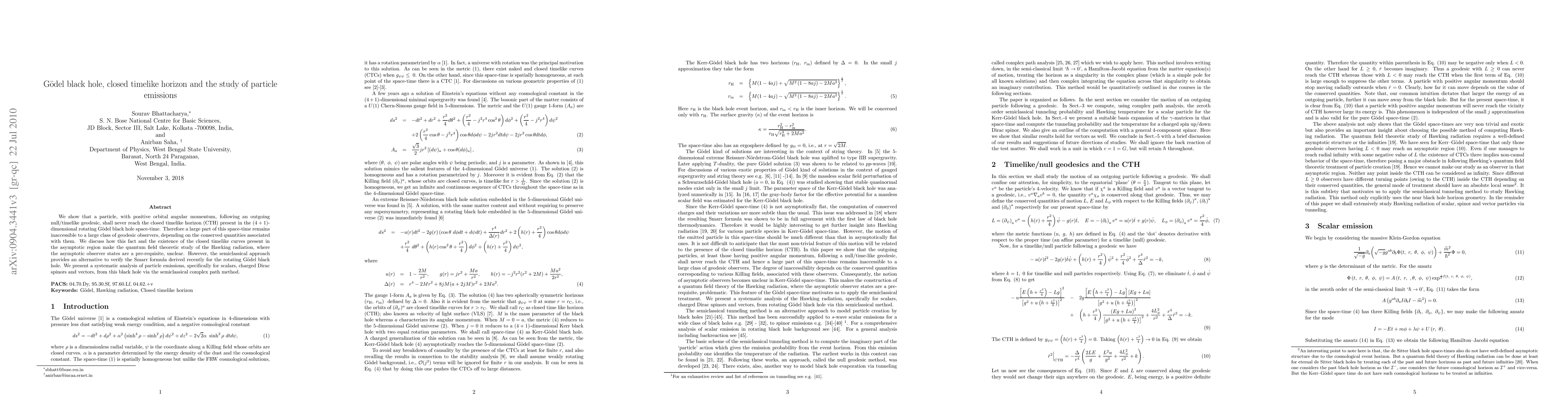 We show that a particle, with positive orbital angular momentum, following an outgoing null/timelike geodesic, shall never reach the closed timelike horizon (CTH) present in the $(4+1)$-dimensional rotating G\"{o}del black hole space-time. Therefore a large part of this space-time remains inaccessible to a large class of geodesic observers, depending on the conserved quantities associated with them. We discuss how this fact and the existence of the closed timelike curves present in the asymptotic region make the quantum field theoretic study of the Hawking radiation, where the asymptotic observer states are a pre-requisite, unclear. However, the semiclassical approach provides an alternative to verify the Smarr formula derived recently for the rotating G\"{o}del black hole. We present a systematic analysis of particle emissions, specifically for scalars, charged Dirac spinors and vectors, from this black hole via the semiclassical complex path method.