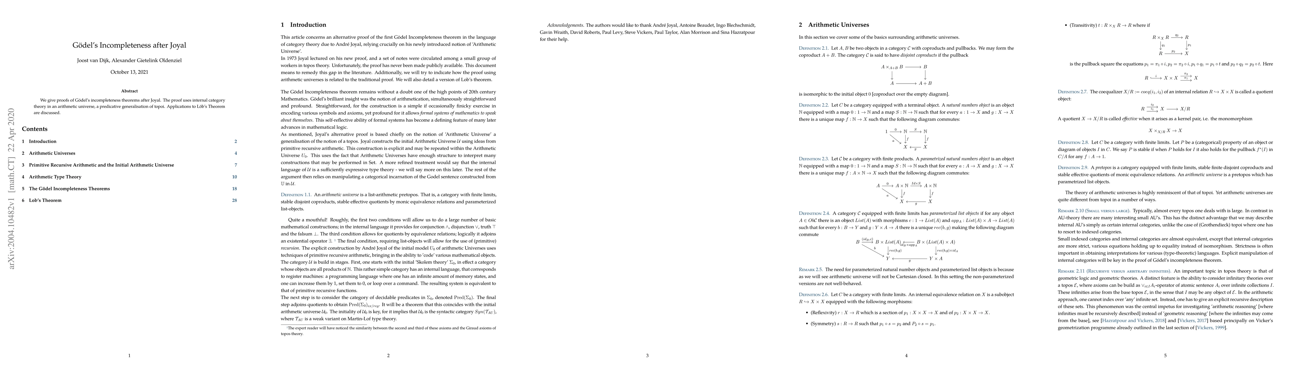 The paper proves G"odel's incompleteness theorems using internal category theory in an arithmetic universe, a predicative generalization of topoi, with applications to L"ob's Theorem.