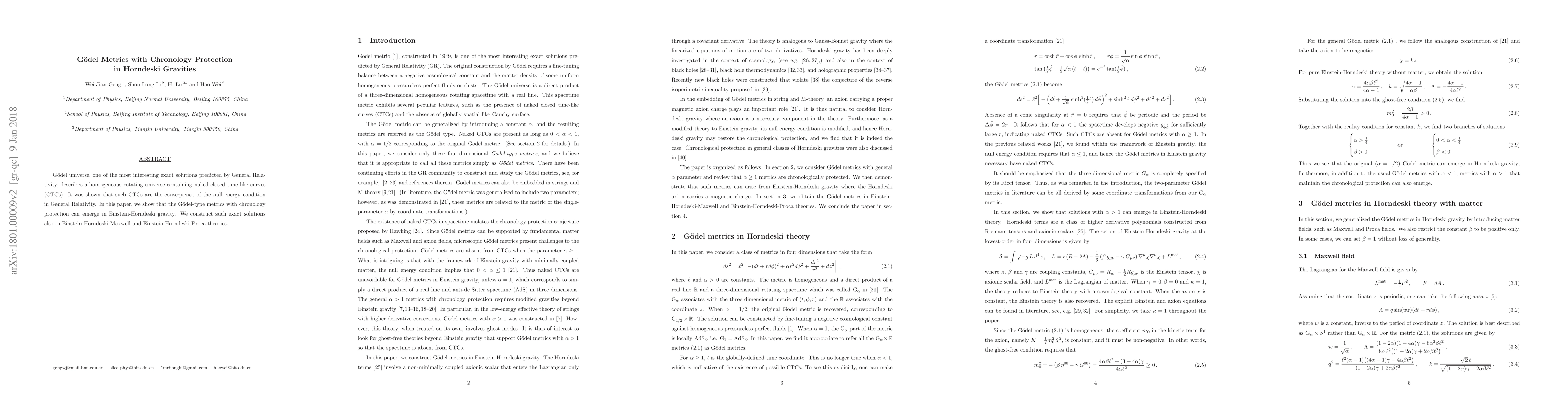 This paper explores the emergence of Gödel-type metrics with chronology protection in Einstein-Horndeski gravity, demonstrating exact solutions that prevent closed time-like curves, and extends this analysis to Einstein-Horndeski-Maxwell and Einstein-Horndeski-Proca theories.