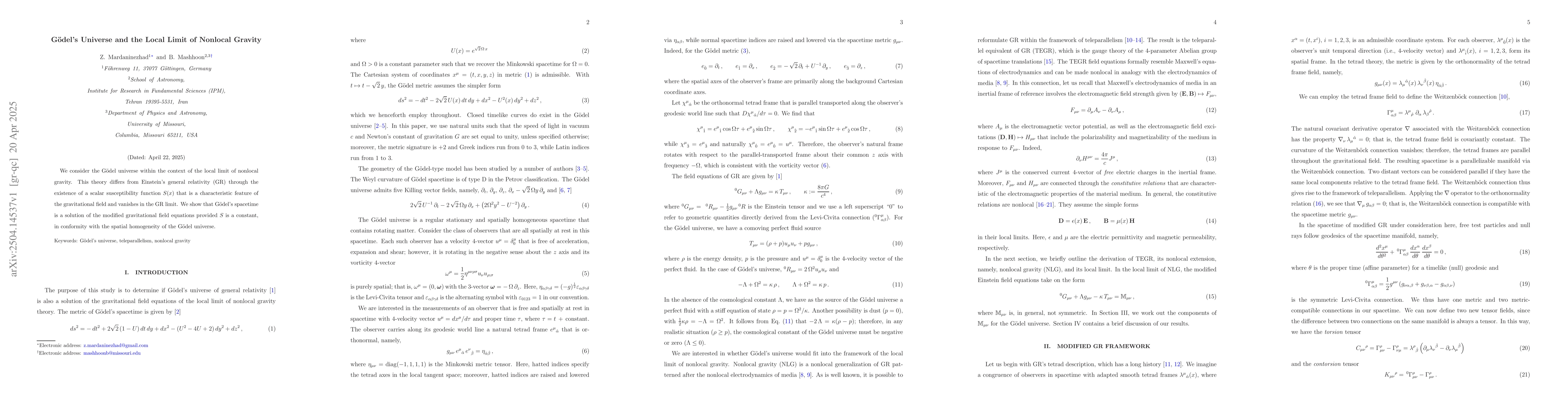 The paper presents a detailed analysis of the local limit of nonlocal gravity and its application to Gödel's universe, introducing a scalar susceptibility function S(x) as a key feature.
