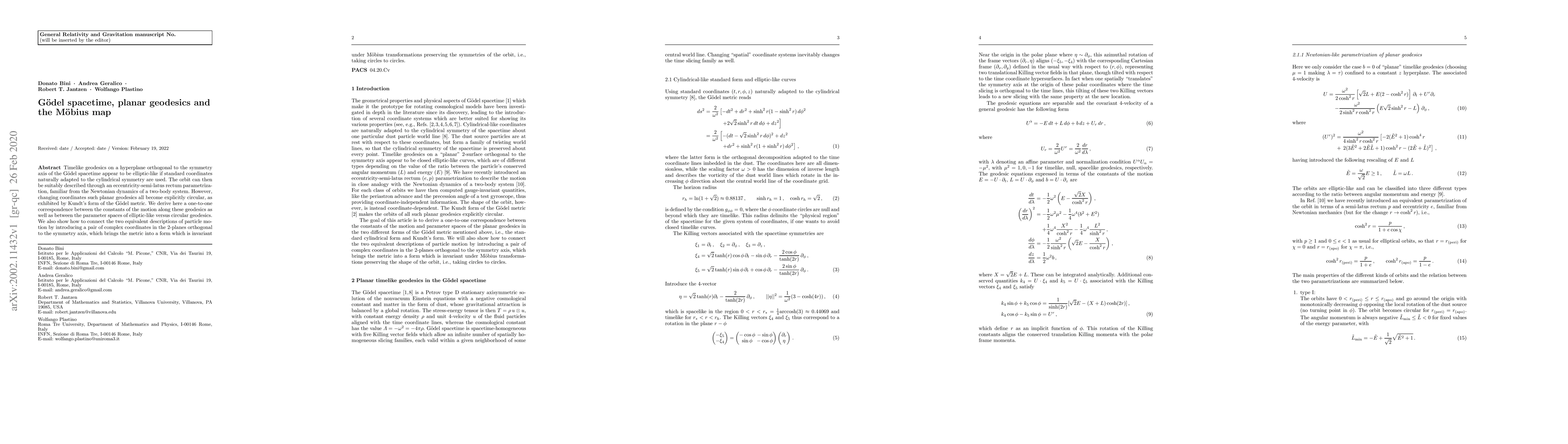 Timelike geodesics on a hyperplane orthogonal to the symmetry axis of the G\"odel spacetime appear to be elliptic-like if standard coordinates naturally adapted to the cylindrical symmetry are used. The orbit can then be suitably described through an eccentricity-semi-latus rectum parametrization, familiar from the Newtonian dynamics of a two-body system. However, changing coordinates such planar geodesics all become explicitly circular, as exhibited by Kundt's form of the G\"odel metric. We derive here a one-to-one correspondence between the constants of the motion along these geodesics as well as between the parameter spaces of elliptic-like versus circular geodesics. We also show how to connect the two equivalent descriptions of particle motion by introducing a pair of complex coordinates in the 2-planes orthogonal to the symmetry axis, which brings the metric into a form which is invariant under M\"obius transformations preserving the symmetries of the orbit, i.e., taking circles to circles.