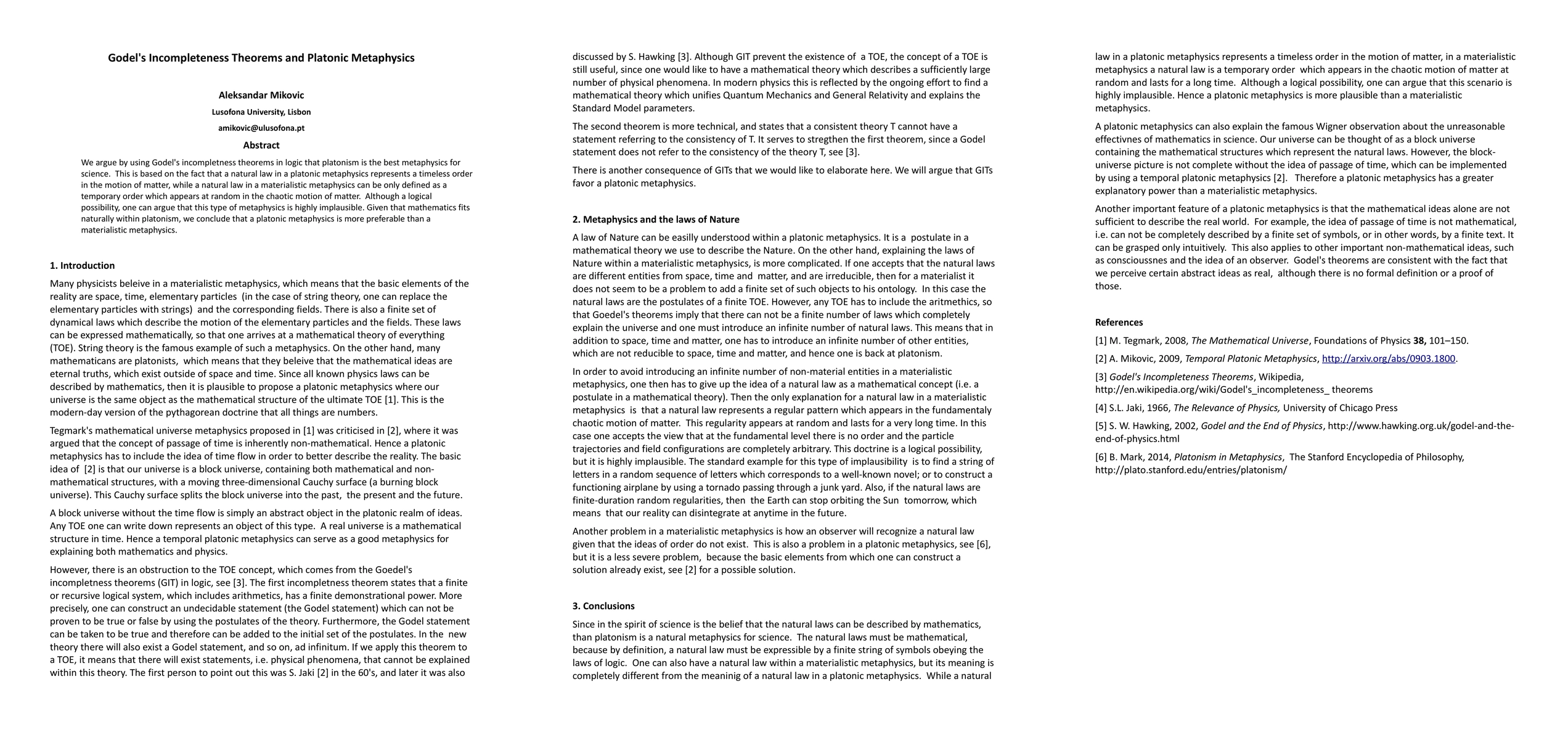 Summary: The paper argues that Gödel's incompleteness theorems support Platonic metaphysics as the best framework for science, positing that natural laws in a Platonic view represent a timeless order, whereas materialistic metaphysics only allows for temporary, random orders. It concludes that mathematics' natural fit within Platonism makes it more preferable than materialism.