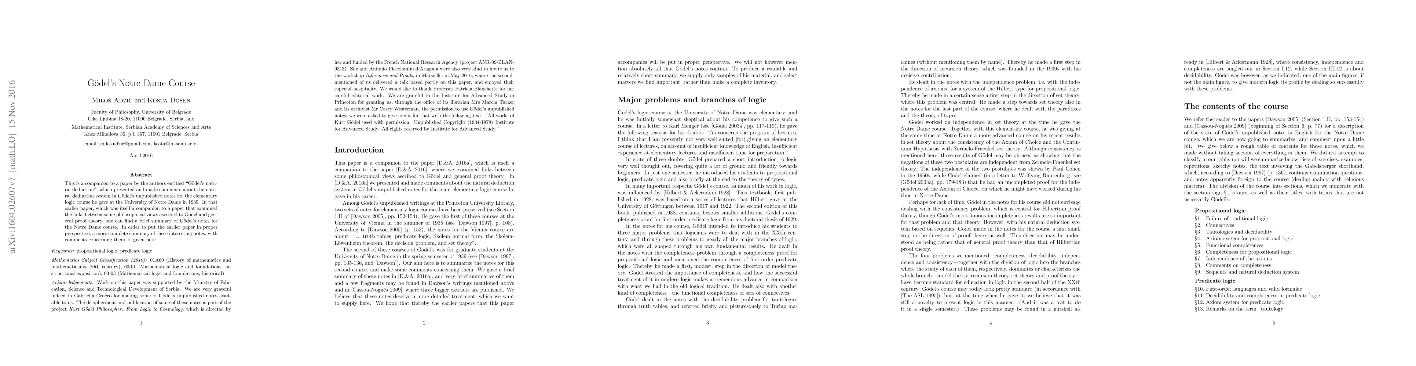 This is a companion to a paper by the authors entitled "G\"odel's natural deduction", which presented and made comments about the natural deduction system in G\"odel's unpublished notes for the elementary logic course he gave at the University of Notre Dame in 1939. In that earlier paper, which was itself a companion to a paper that examined the links between some philosophical views ascribed to G\"odel and general proof theory, one can find a brief summary of G\"odel's notes for the Notre Dame course. In order to put the earlier paper in proper perspective, a more complete summary of these interesting notes, with comments concerning them, is given here.