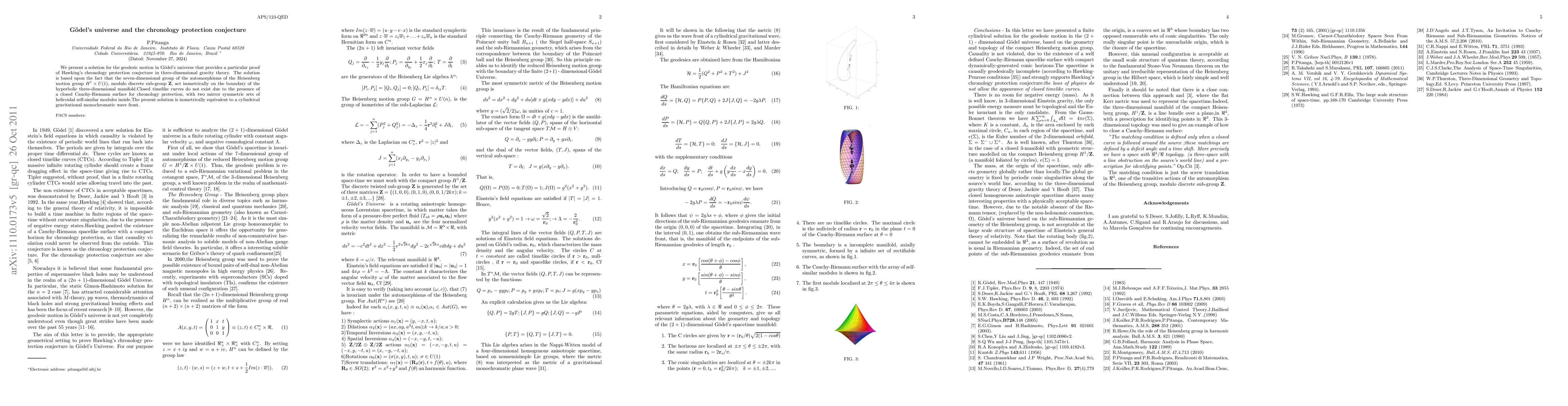 The research proves Hawking's chronology protection conjecture in Gödel's universe by demonstrating the absence of closed timelike curves, supported by the isometric action of the automorphism group on the boundary of a hyperbolic manifold, leading to a closed Cauchy-Riemann surface. The solution also reveals two mirror symmetric sets of helicoidal self-similar modules.