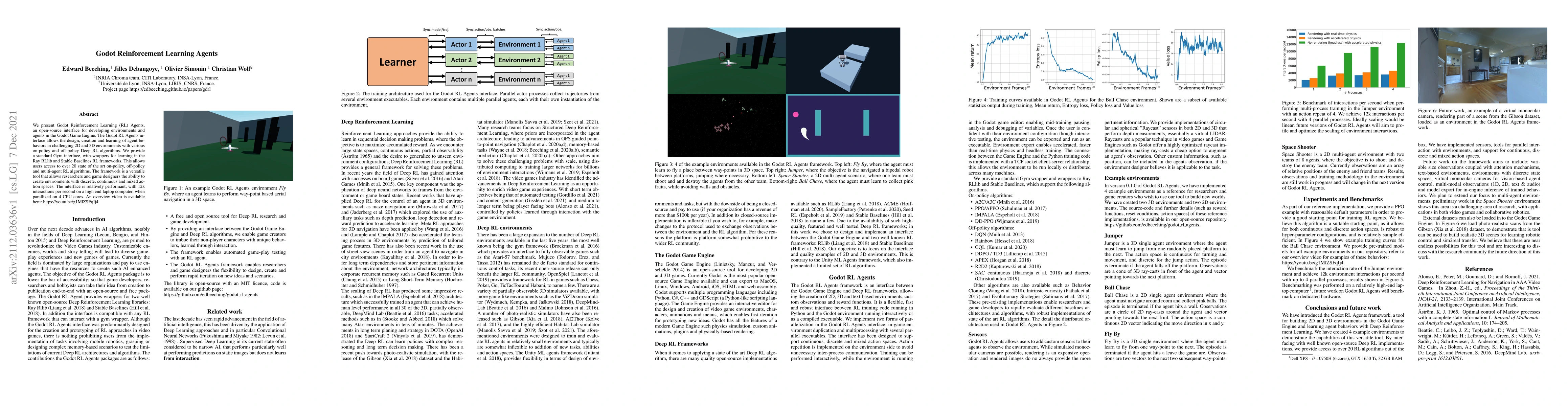 This paper introduces Godot Reinforcement Learning Agents, an open-source interface for developing RL environments and agents within the Godot Game Engine, supporting various Deep RL algorithms and providing a standard Gym interface for integration with Ray RLlib and Stable Baselines. The framework enables efficient creation of environments with diverse action spaces and supports parallel processing for high performance.