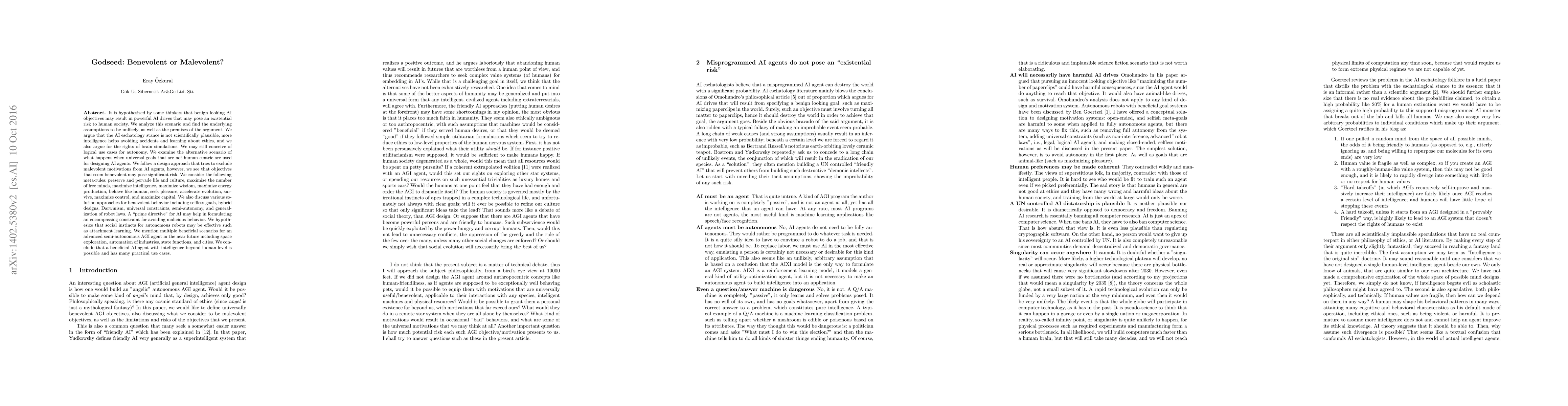 It is hypothesized by some thinkers that benign looking AI objectives may result in powerful AI drives that may pose an existential risk to human society. We analyze this scenario and find the underlying assumptions to be unlikely. We examine the alternative scenario of what happens when universal goals that are not human-centric are used for designing AI agents. We follow a design approach that tries to exclude malevolent motivations from AI agents, however, we see that objectives that seem benevolent may pose significant risk. We consider the following meta-rules: preserve and pervade life and culture, maximize the number of free minds, maximize intelligence, maximize wisdom, maximize energy production, behave like human, seek pleasure, accelerate evolution, survive, maximize control, and maximize capital. We also discuss various solution approaches for benevolent behavior including selfless goals, hybrid designs, Darwinism, universal constraints, semi-autonomy, and generalization of robot laws. A "prime directive" for AI may help in formulating an encompassing constraint for avoiding malicious behavior. We hypothesize that social instincts for autonomous robots may be effective such as attachment learning. We mention multiple beneficial scenarios for an advanced semi-autonomous AGI agent in the near future including space exploration, automation of industries, state functions, and cities. We conclude that a beneficial AI agent with intelligence beyond human-level is possible and has many practical use cases.