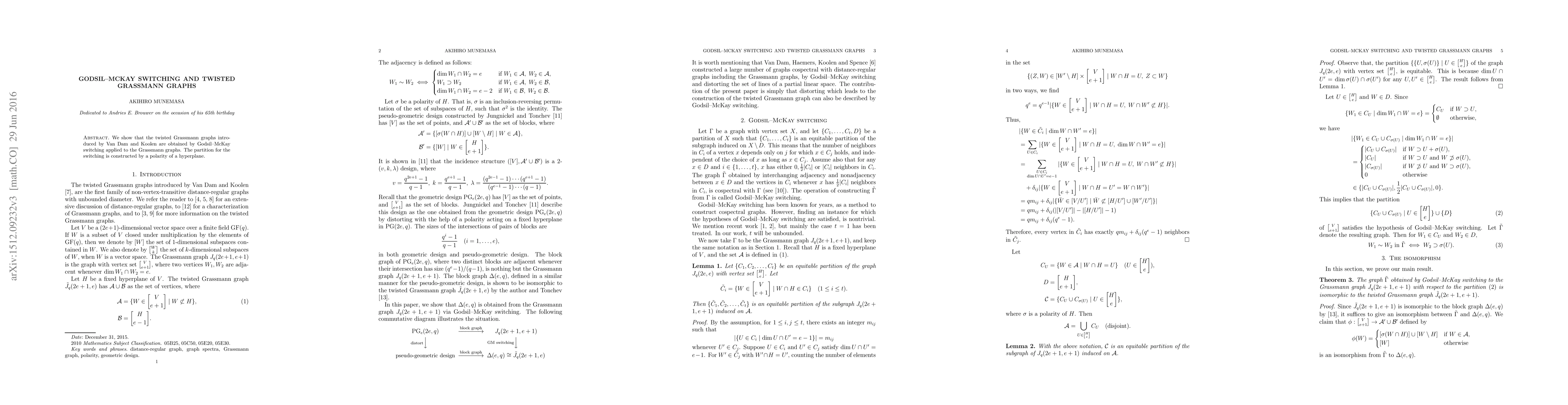 Research shows that twisted Grassmann graphs can be created by applying Godsil-McKay switching to regular Grassmann graphs, using a specific partition based on hyperplane polarity.