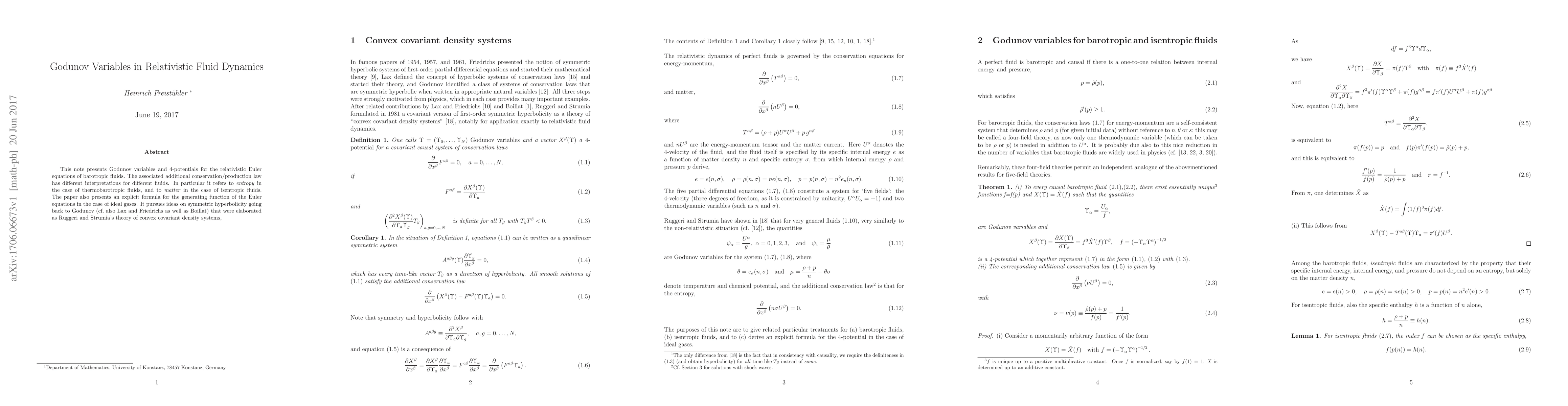 This note presents Godunov variables and 4-potentials for the relativistic Euler equations of barotropic fluids. The associated additional conservation/ production law has different interpretations for different fluids. In particular it refers to ENTROPY in the case of thermobarotropic fluids, and to MATTER in the case of isentropic fluids. The paper also presents an explicit formula for the generating function of the Euler equations in the case of ideal gases. It pursues ideas on symmetric hyperbolicity going back to Godunov (cf. also Lax and Friedrichs as well as Boillat) that were elaborated as Ruggeri and Strumia's theory of convex covariant density systems.