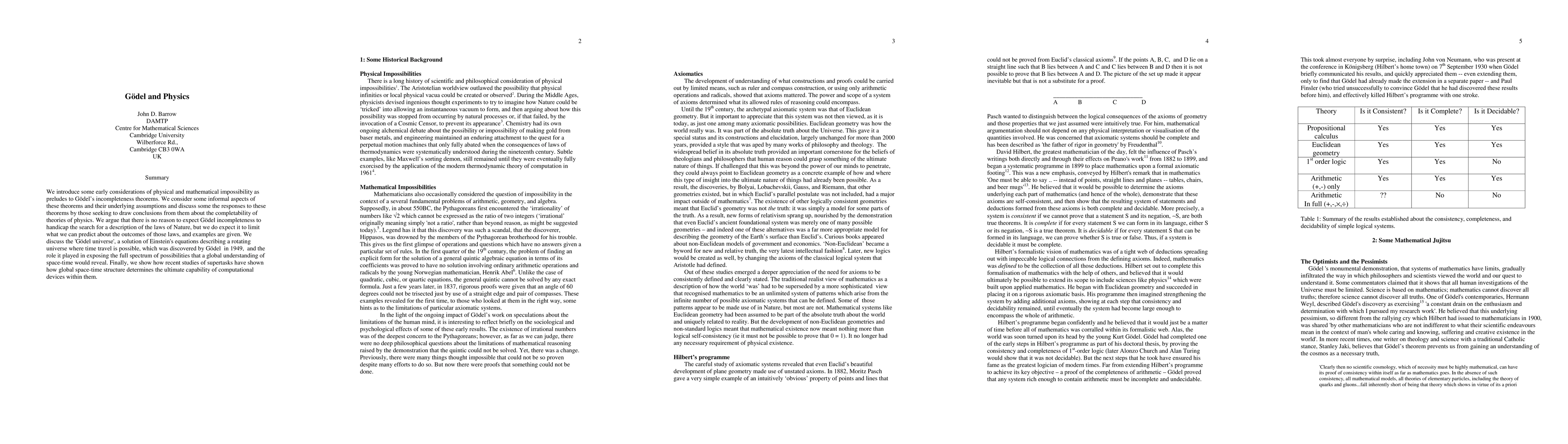 We introduce some early considerations of physical and mathematical impossibility as preludes to the Goedel incompleteness theorems. We consider some informal aspects of these theorems and their underlying assumptions and discuss some the responses to these theorems by those seeking to draw conclusions from them about the completability of theories of physics. We argue that there is no reason to expect Goedel incompleteness to handicap the search for a description of the laws of Nature, but we do expect it to limit what we can predict about the outcomes of those laws, and examples are given. We discuss the Goedel universe and the role it played in exposing the full spectrum of possibilities that a global understanding of space-time would reveal. Finally,we show how recent studies of supertasks have shown how global space-time structure determines the ultimate capability of computational devices within them.