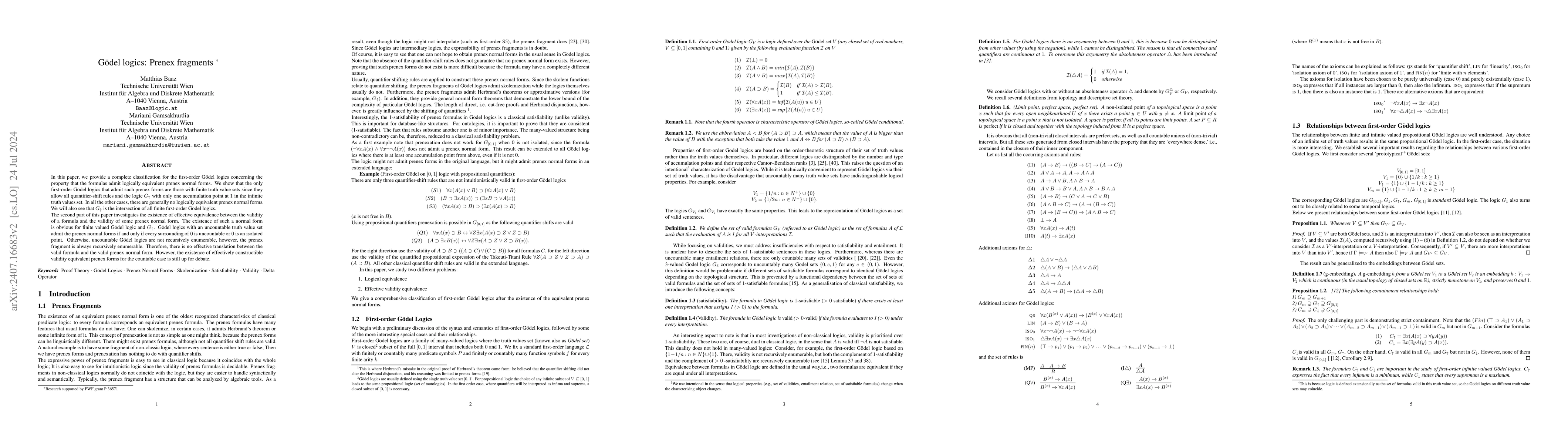This paper classifies first-order Goedel logics based on the existence of logically equivalent prenex normal forms, finding that only logics with finite truth value sets allow such forms. The logic $G_\uparrow$ with a single accumulation point is identified as the intersection of all finite first-order Goedel logics. It also explores effective equivalence between formulas and prenex normal forms, revealing that uncountable Goedel logics are not recursively enumerable unless certain conditions are met.