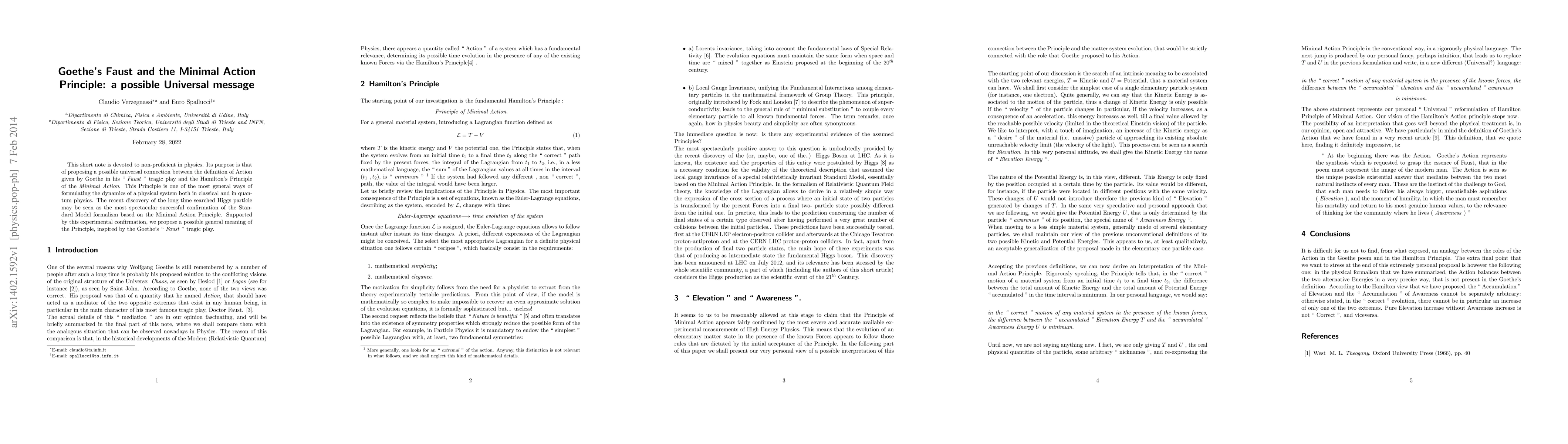 This short note is devoted to non-proficient in physics. Its purpose is that of proposing a possible universal connection between the definition of Action given by Goethe in his ``Faust'' tragic play and the Hamilton's Principle of the Minimal Action. This Principle is one of the most general ways of formulating the dynamics of a physical system both in classical and in quantum physics. The recent discovery of the long time searched Higgs particle may be seen as the most spectacular successful confirmation of the Standard Model formalism based on the Minimal Action Principle. Supported by this experimental confirmation, we propose a possible general meaning of the Principle, inspired by the Goethe's ``Faust'' tragic play.