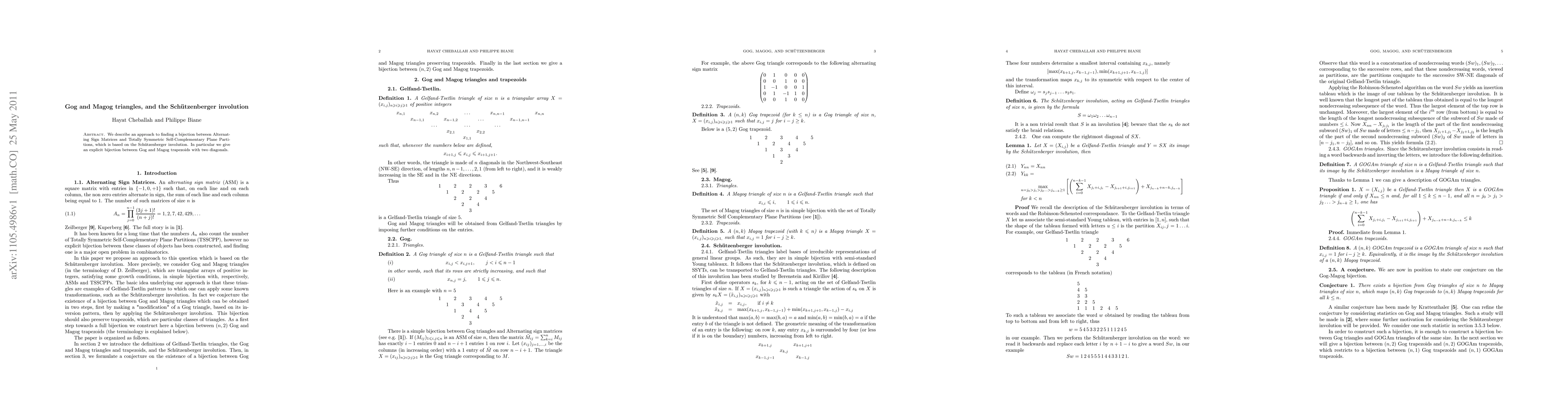 Summary: This paper presents a method to establish a bijection between Alternating Sign Matrices and Totally Symmetric Self-Complementary Plane Partitions using the Schutzenberger involution, specifically detailing an explicit connection between Gog and Magog trapezoids with two diagonals.