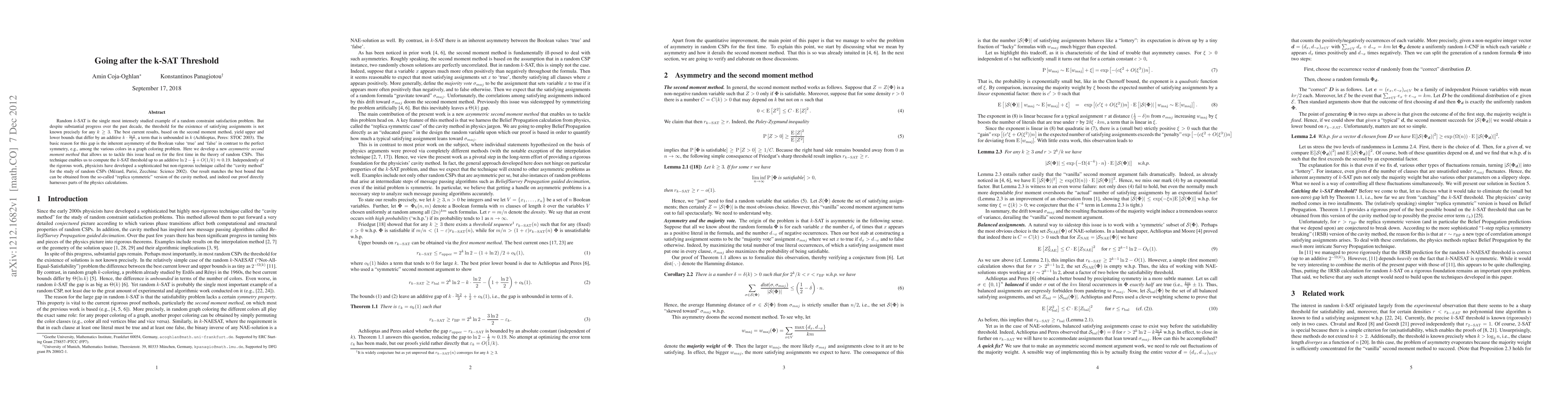 Random $k$-SAT is the single most intensely studied example of a random constraint satisfaction problem. But despite substantial progress over the past decade, the threshold for the existence of satisfying assignments is not known precisely for any $k\geq3$. The best current results, based on the second moment method, yield upper and lower bounds that differ by an additive $k\cdot \frac{\ln2}2$, a term that is unbounded in $k$ (Achlioptas, Peres: STOC 2003). The basic reason for this gap is the inherent asymmetry of the Boolean value `true' and `false' in contrast to the perfect symmetry, e.g., among the various colors in a graph coloring problem. Here we develop a new asymmetric second moment method that allows us to tackle this issue head on for the first time in the theory of random CSPs. This technique enables us to compute the $k$-SAT threshold up to an additive $\ln2-\frac12+O(1/k)\approx 0.19$. Independently of the rigorous work, physicists have developed a sophisticated but non-rigorous technique called the "cavity method" for the study of random CSPs (M\'ezard, Parisi, Zecchina: Science 2002). Our result matches the best bound that can be obtained from the so-called "replica symmetric" version of the cavity method, and indeed our proof directly harnesses parts of the physics calculations.