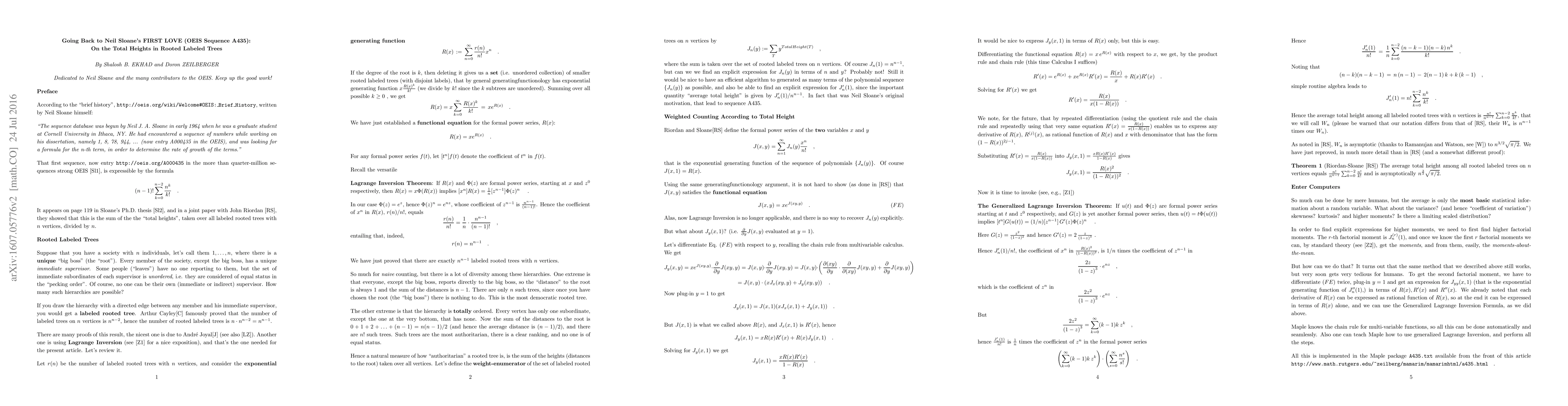 In this tribute to Neil Sloane, we revisit the first sequence in the On-Line Encyclopedia of Integer Sequences, sequence A435 (1, 8, 78, 944, 13800, 237432, 4708144, 105822432, ...), that he encountered when he was a graduate student, and when normalized gives the average total height of rooted labeled trees. We state rigorously-computed explicit expressions for the first twelve moments of the random variable `total height' on rooted labeled trees, and pledge to donate to the OEIS 100 dollars in honor of the first to find an explicit expression for the probability density function of the limiting scaled probability distribution, as n goes to infinity.