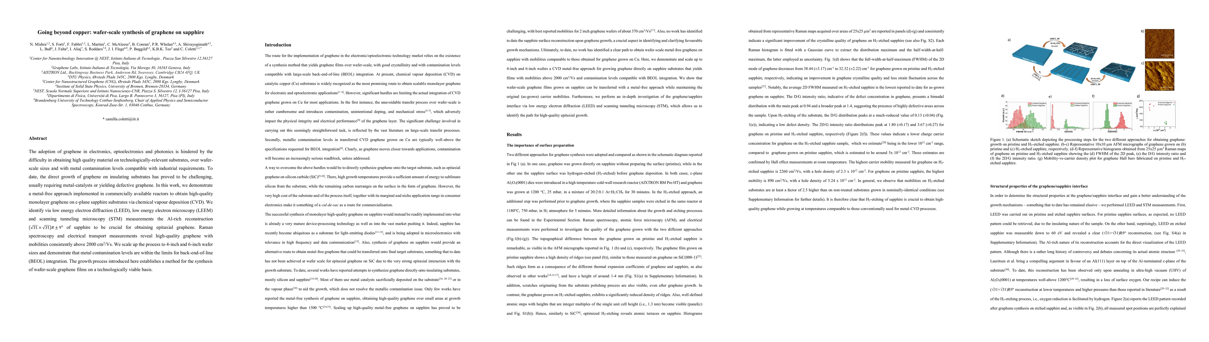 This paper details a metal-free method for growing high-quality monolayer graphene on c-plane sapphire substrates using CVD, identifying the Al-rich reconstruction root31R9 of sapphire as key. The process yields graphene with mobilities above 2000 cm²/Vs and scales to 4-inch and 6-inch wafer sizes with metal contamination suitable for BEOL integration.