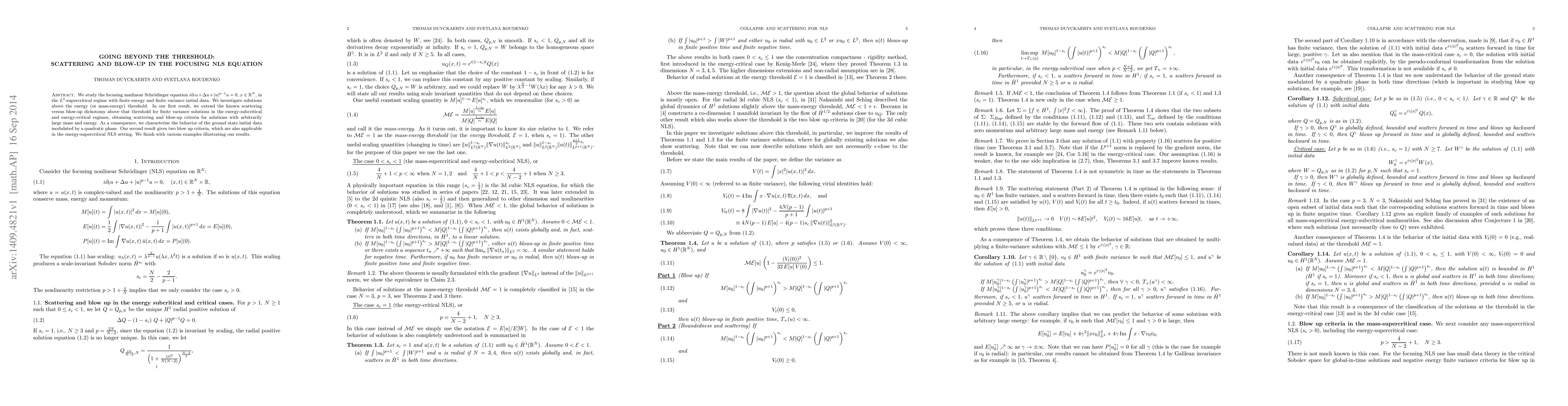 This paper investigates the focusing nonlinear Schrödinger equation in $L^2$-supercritical regimes, focusing on solutions above the energy threshold. It extends scattering versus blow-up criteria to solutions with large mass and energy, and provides two blow-up criteria applicable in energy-supercritical settings, illustrated with examples.