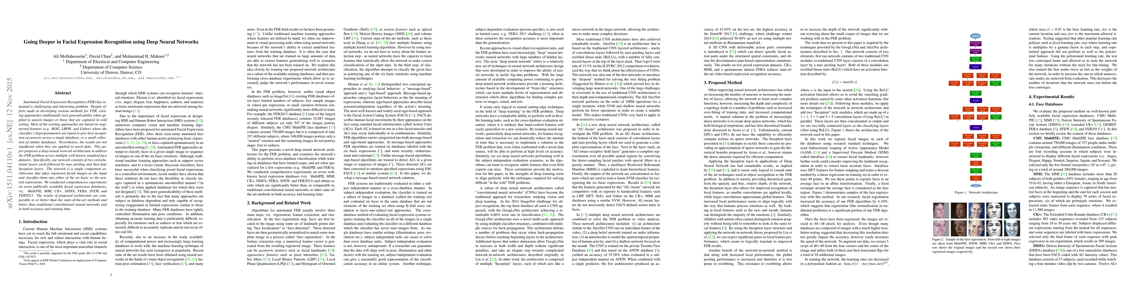This paper proposes a deep neural network architecture using convolutional and Inception layers for automated facial expression recognition, demonstrating improved accuracy and training time compared to traditional methods across seven standard facial expression datasets. The network's performance shows better generalizability to novel data.