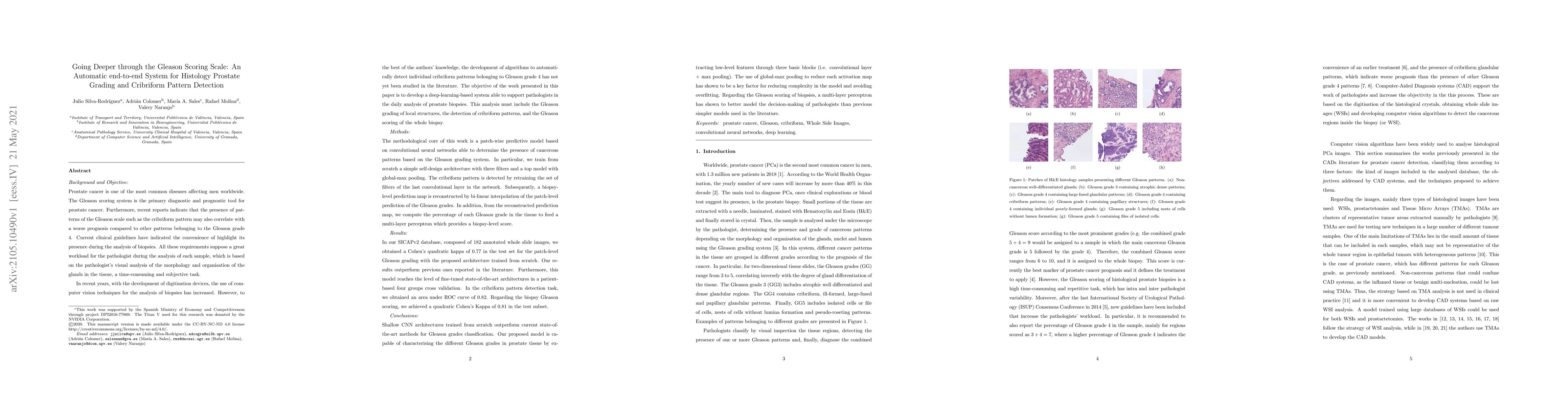 This paper develops a deep-learning system using convolutional neural networks to automate prostate cancer grading via the Gleason scoring system, focusing on detecting cribriform patterns. The proposed model, trained from scratch, outperforms previous methods in Gleason grading and cribriform pattern detection, achieving a Cohen's quadratic kappa of 0.81 and an AUC of 0.82 respectively.