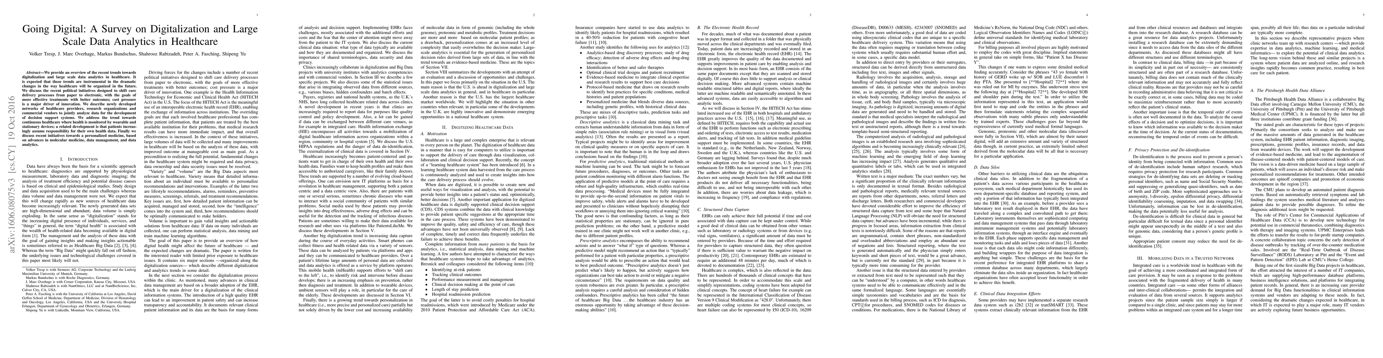 We provide an overview of the recent trends towards digitalization and large scale data analytics in healthcare. It is expected that these trends are instrumental in the dramatic changes in the way healthcare will be organized in the future. We discuss the recent political initiatives designed to shift care delivery processes from paper to electronic, with the goals of more effective treatments with better outcomes; cost pressure is a major driver of innovation. We describe newly developed networks of healthcare providers, research organizations and commercial vendors to jointly analyze data for the development of decision support systems. We address the trend towards continuous healthcare where health is monitored by wearable and stationary devices; a related development is that patients increasingly assume responsibility for their own health data. Finally we discuss recent initiatives towards a personalized medicine, based on advances in molecular medicine, data management, and data analytics.