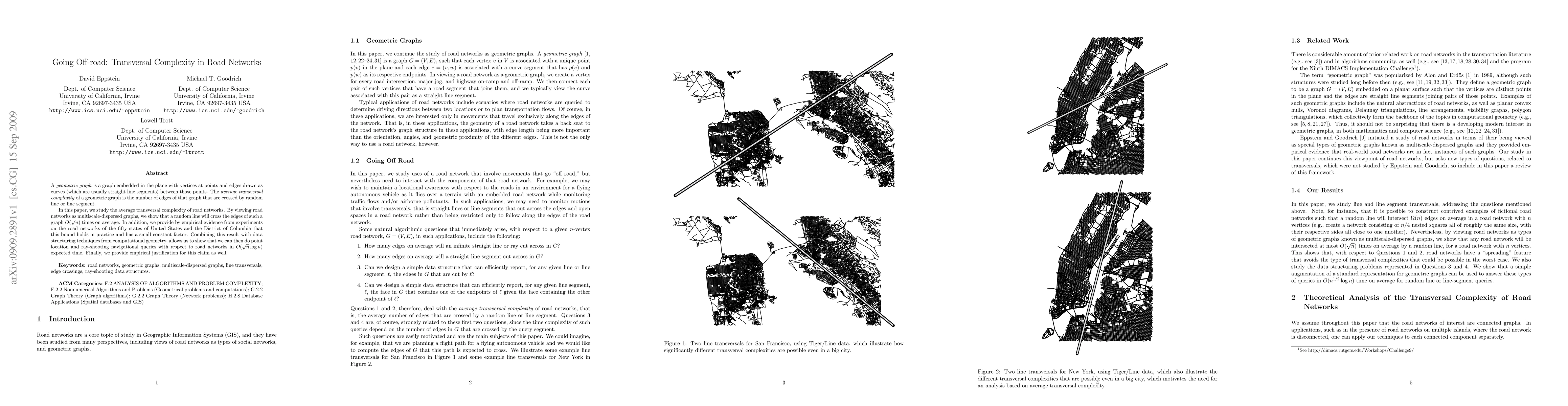 A geometric graph is a graph embedded in the plane with vertices at points and edges drawn as curves (which are usually straight line segments) between those points. The average transversal complexity of a geometric graph is the number of edges of that graph that are crossed by random line or line segment. In this paper, we study the average transversal complexity of road networks. By viewing road networks as multiscale-dispersed graphs, we show that a random line will cross the edges of such a graph O(sqrt(n)) times on average. In addition, we provide by empirical evidence from experiments on the road networks of the fifty states of United States and the District of Columbia that this bound holds in practice and has a small constant factor. Combining this result with data structuring techniques from computational geometry, allows us to show that we can then do point location and ray-shooting navigational queries with respect to road networks in O(sqrt(n) log n) expected time. Finally, we provide empirical justification for this claim as well.