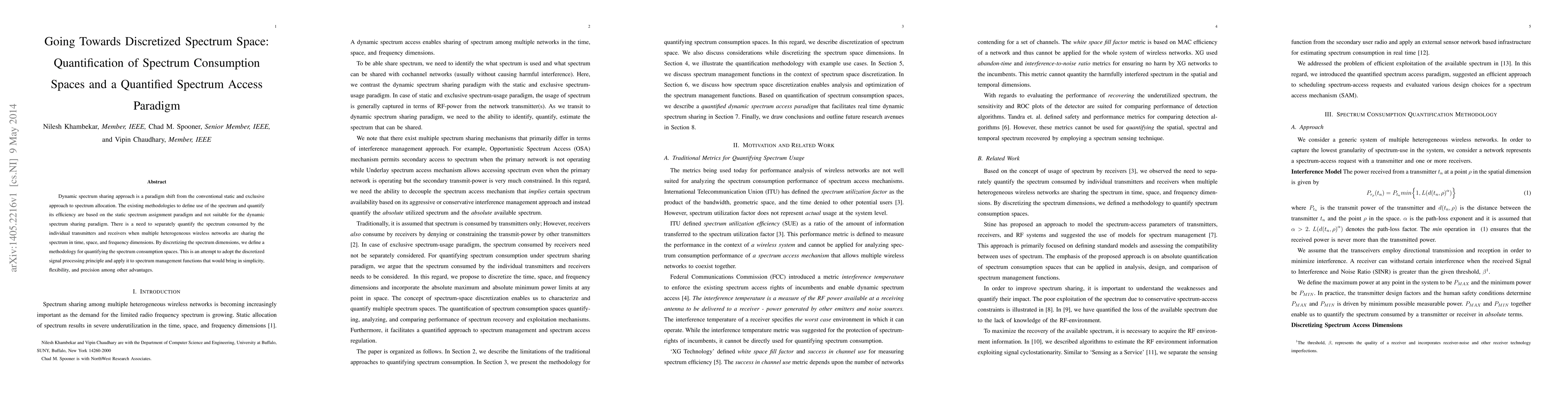 This paper proposes a new methodology to quantify spectrum consumption spaces for dynamic spectrum sharing, moving away from static spectrum allocation. It introduces a discretized spectrum access paradigm to measure individual transmitter and receiver spectrum usage in heterogeneous wireless networks.
