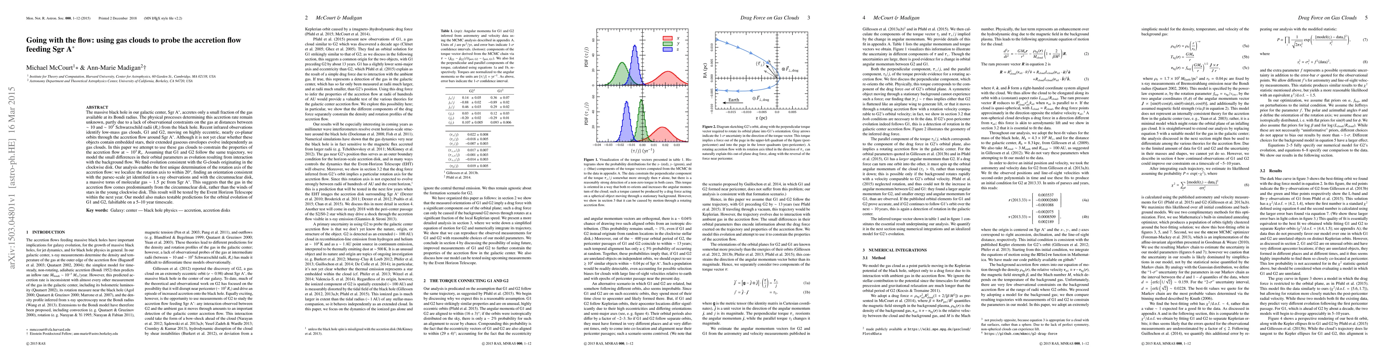 The massive black hole in our galactic center, Sgr A*, accretes only a small fraction of the gas available at its Bondi radius. The physical processes determining this accretion rate remain unknown, partly due to a lack of observational constraints on the gas at distances between ~10 and ~10$^5$ Schwarzschild radii (Rs) from the black hole. Recent infrared observations identify low-mass gas clouds, G1 and G2, moving on highly eccentric, nearly co-planar orbits through the accretion flow around Sgr A*. Although it is not yet clear whether these objects contain embedded stars, their extended gaseous envelopes evolve independently as gas clouds. In this paper we attempt to use these gas clouds to constrain the properties of the accretion flow at ~10$^3$ Rs. Assuming that G1 and G2 follow the same trajectory, we model the small differences in their orbital parameters as evolution resulting from interaction with the background flow. We find evolution consistent with the G-clouds originating in the clockwise disk. Our analysis enables the first unique determination of the rotation axis of the accretion flow: we localize the rotation axis to within 20 degrees, finding an orientation consistent with the parsec-scale jet identified in x-ray observations and with the circumnuclear disk, a massive torus of molecular gas ~1.5 pc from Sgr A*. This suggests that the gas in the accretion flow comes predominantly from the circumnuclear disk, rather than the winds of stars in the young clockwise disk. This result will be tested by the Event Horizon Telescope within the next year. Our model also makes testable predictions for the orbital evolution of G1 and G2, falsifiable on a 5-10 year timescale.