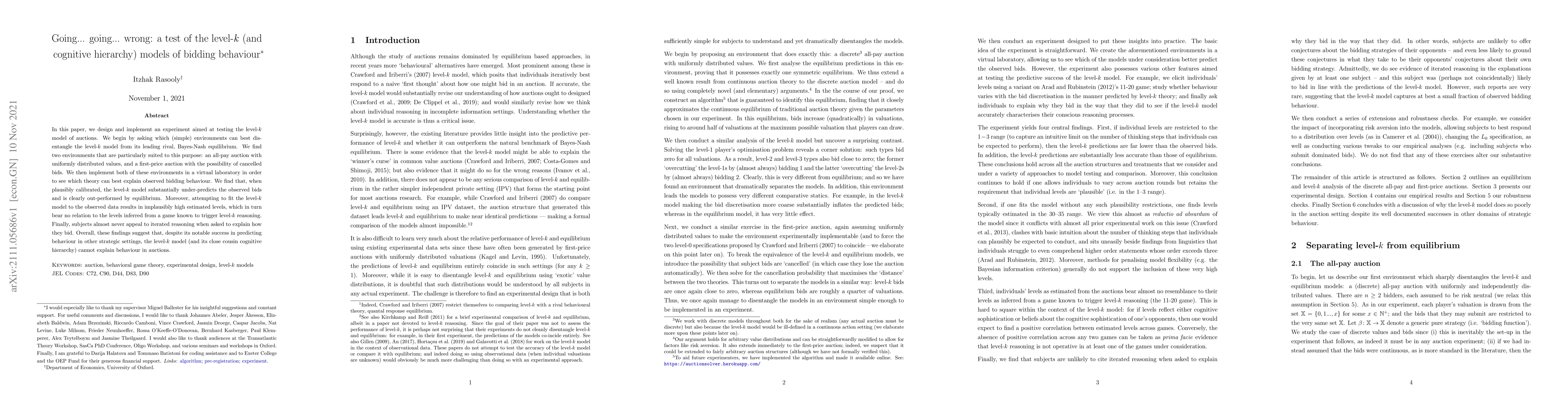 In this paper, we design and implement an experiment aimed at testing the level-k model of auctions. We begin by asking which (simple) environments can best disentangle the level-k model from its leading rival, Bayes-Nash equilibrium. We find two environments that are particularly suited to this purpose: an all-pay auction with uniformly distributed values, and a first-price auction with the possibility of cancelled bids. We then implement both of these environments in a virtual laboratory in order to see which theory can best explain observed bidding behaviour. We find that, when plausibly calibrated, the level-k model substantially under-predicts the observed bids and is clearly out-performed by equilibrium. Moreover, attempting to fit the level-k model to the observed data results in implausibly high estimated levels, which in turn bear no relation to the levels inferred from a game known to trigger level-k reasoning. Finally, subjects almost never appeal to iterated reasoning when asked to explain how they bid. Overall, these findings suggest that, despite its notable success in predicting behaviour in other strategic settings, the level-k model (and its close cousin cognitive hierarchy) cannot explain behaviour in auctions.