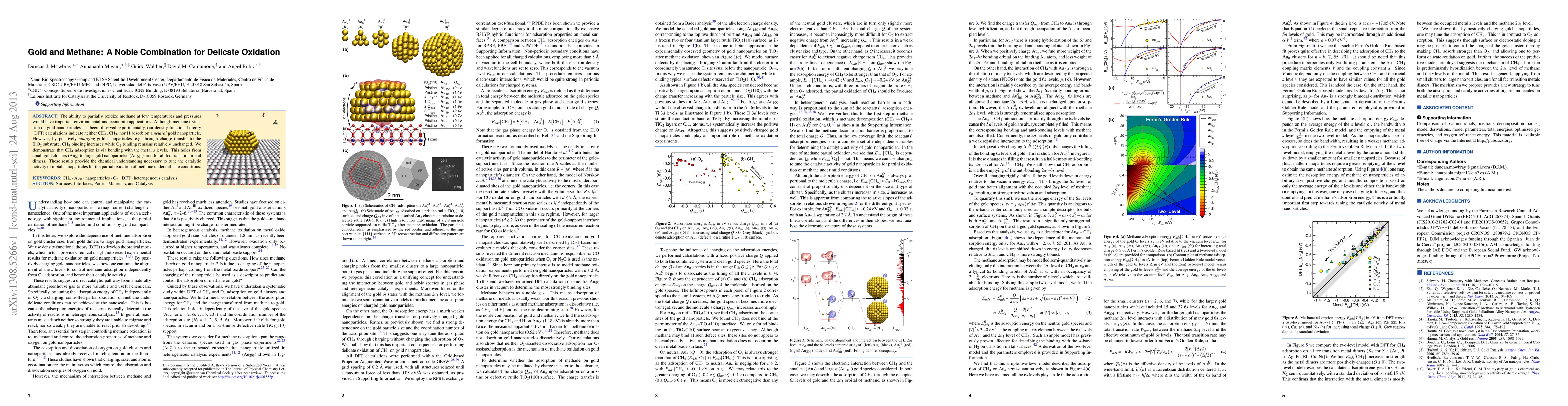 This research explores the partial oxidation of methane on gold nanoparticles, revealing that positively charged gold nanoparticles, through charge transfer to the TiO2 substrate, enhance methane adsorption while maintaining oxygen binding. Density functional theory calculations show that methane binds via metal s levels across various gold cluster sizes.