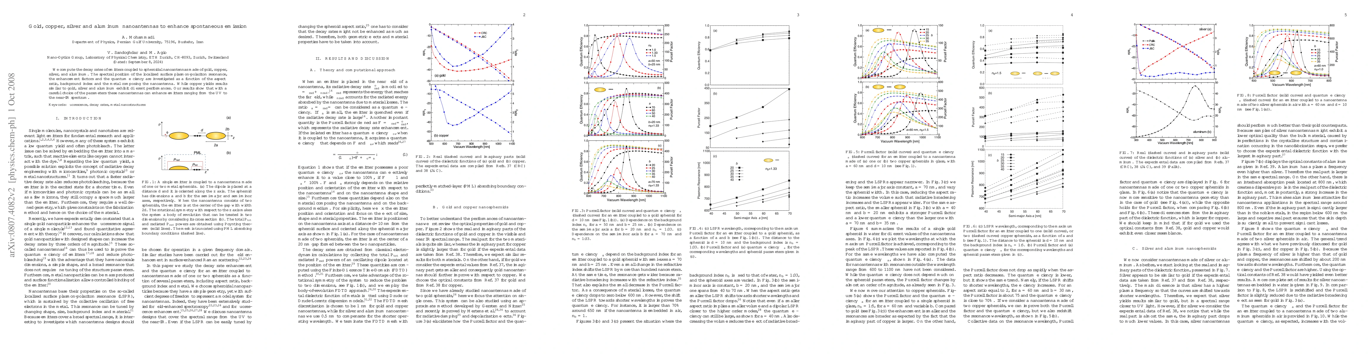 We compute the decay rates of emitters coupled to spheroidal nanoantennas made of gold, copper, silver, and aluminum. The spectral position of the localized surface plasmon-polariton resonance, the enhancement factors and the quantum efficiency are investigated as a function of the aspect ratio, background index and the metal composing the nanoantenna. While copper yields results similar to gold, silver and aluminum exhibit different performances. Our results show that with a careful choice of the parameters these nanoantennas can enhance emitters ranging from the UV to the near-IR spectrum.