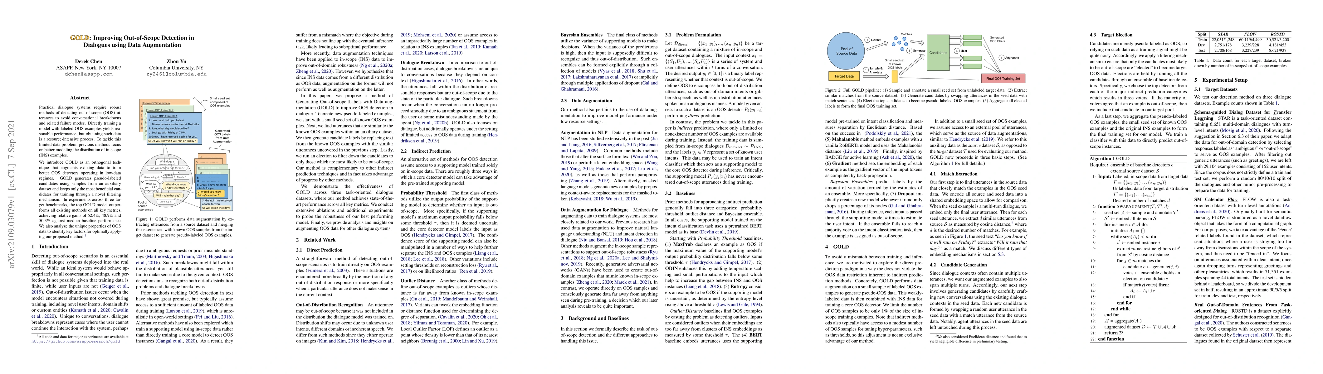 Practical dialogue systems require robust methods of detecting out-of-scope (OOS) utterances to avoid conversational breakdowns and related failure modes. Directly training a model with labeled OOS examples yields reasonable performance, but obtaining such data is a resource-intensive process. To tackle this limited-data problem, previous methods focus on better modeling the distribution of in-scope (INS) examples. We introduce GOLD as an orthogonal technique that augments existing data to train better OOS detectors operating in low-data regimes. GOLD generates pseudo-labeled candidates using samples from an auxiliary dataset and keeps only the most beneficial candidates for training through a novel filtering mechanism. In experiments across three target benchmarks, the top GOLD model outperforms all existing methods on all key metrics, achieving relative gains of 52.4%, 48.9% and 50.3% against median baseline performance. We also analyze the unique properties of OOS data to identify key factors for optimally applying our proposed method.