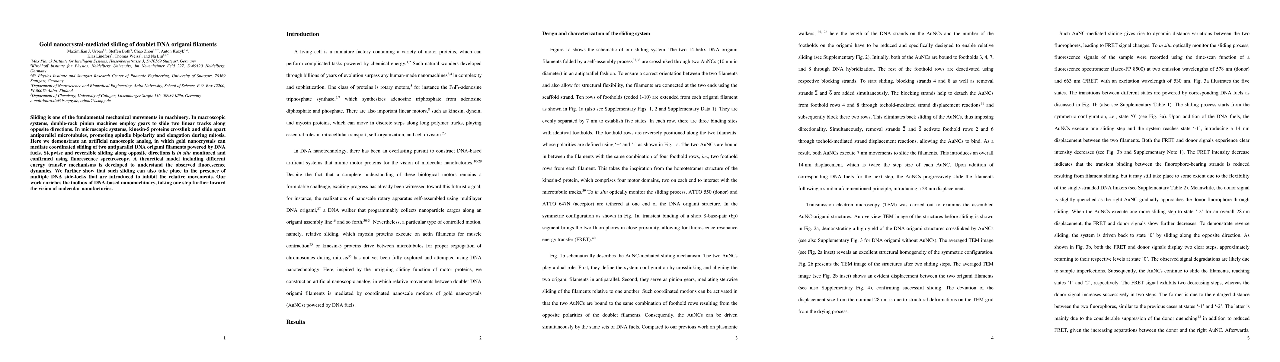 This paper demonstrates the use of gold nanocrystals to mediate the sliding of two antiparallel DNA origami filaments, powered by DNA fuels, with stepwise and reversible motion monitored via fluorescence spectroscopy. The study also introduces a theoretical model to explain the observed dynamics and shows that sliding can occur even with additional DNA sidelocks.